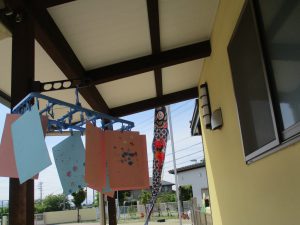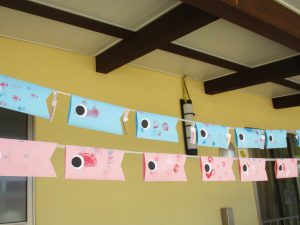 タンポの作品も鯉のぼりに仕立てて子どもたちの大好きなテラスに飾りました。