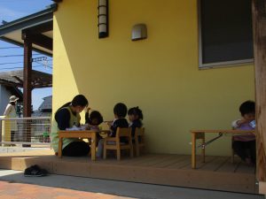 戸外の空気をたくさん感じてすごしてほしいという思いから、テラスで日々遊んだりおやつを食べたりしています。