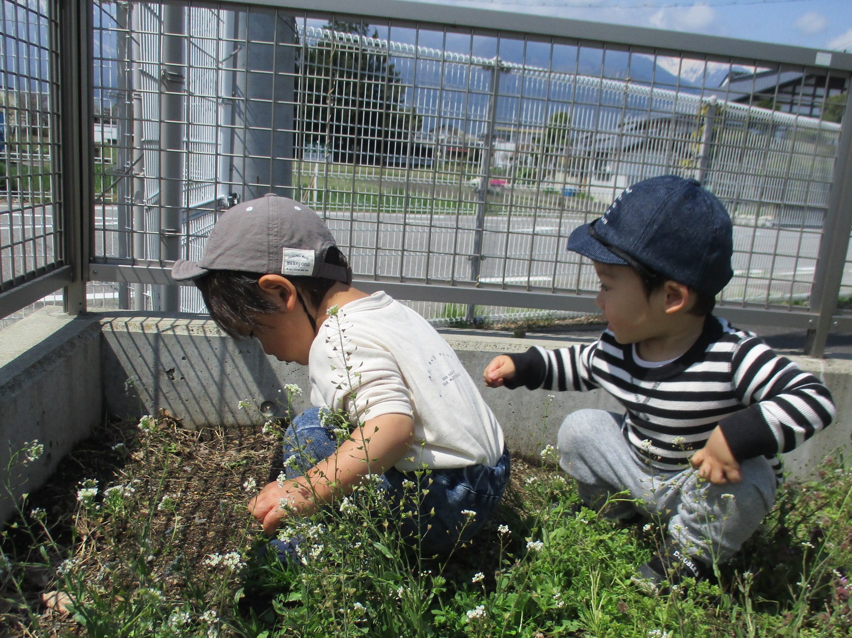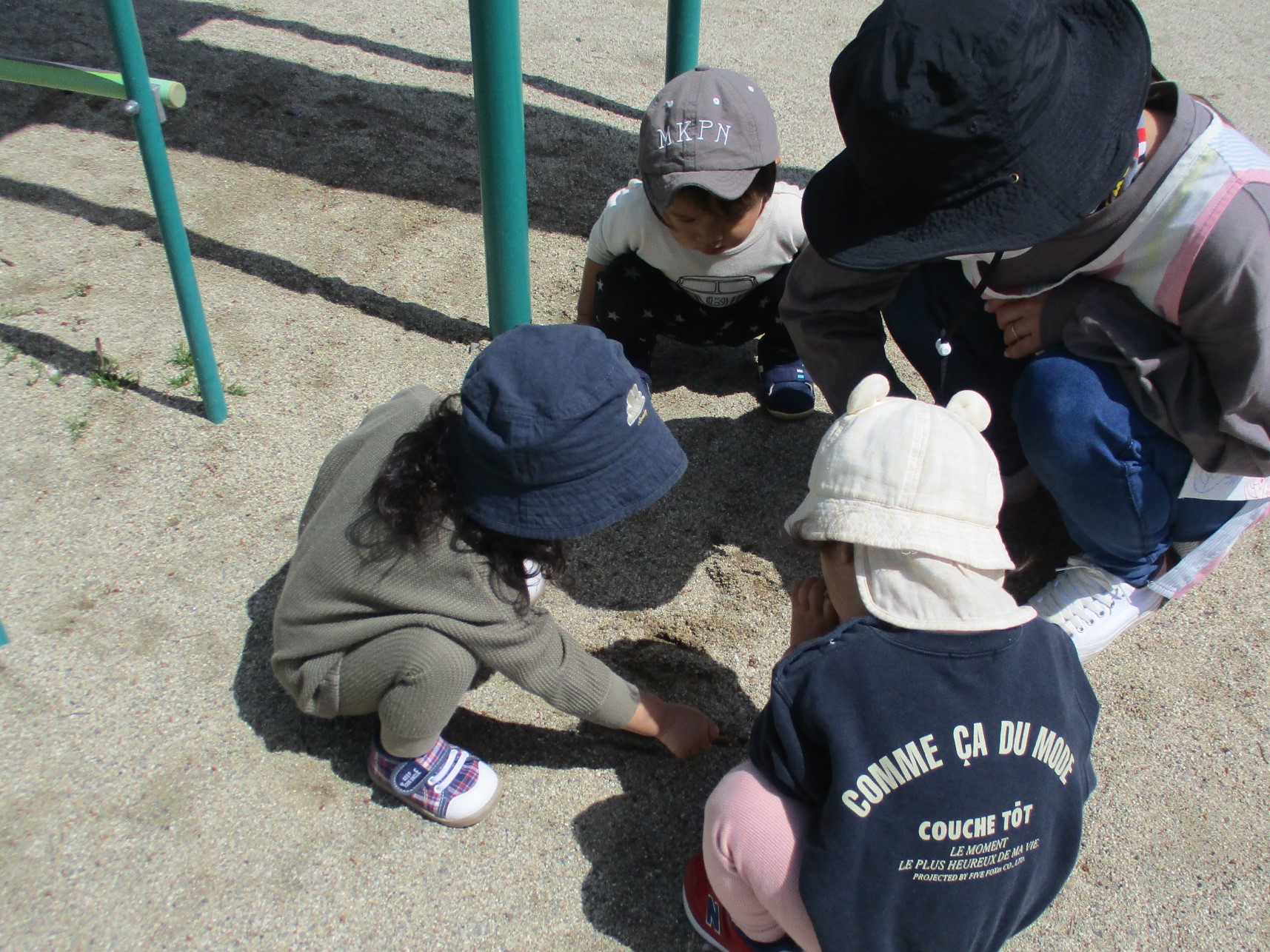 園庭では友だちと築山に登ったり、ありを見つけてじっとみたりして毎日元気いっぱいあそんでいます。