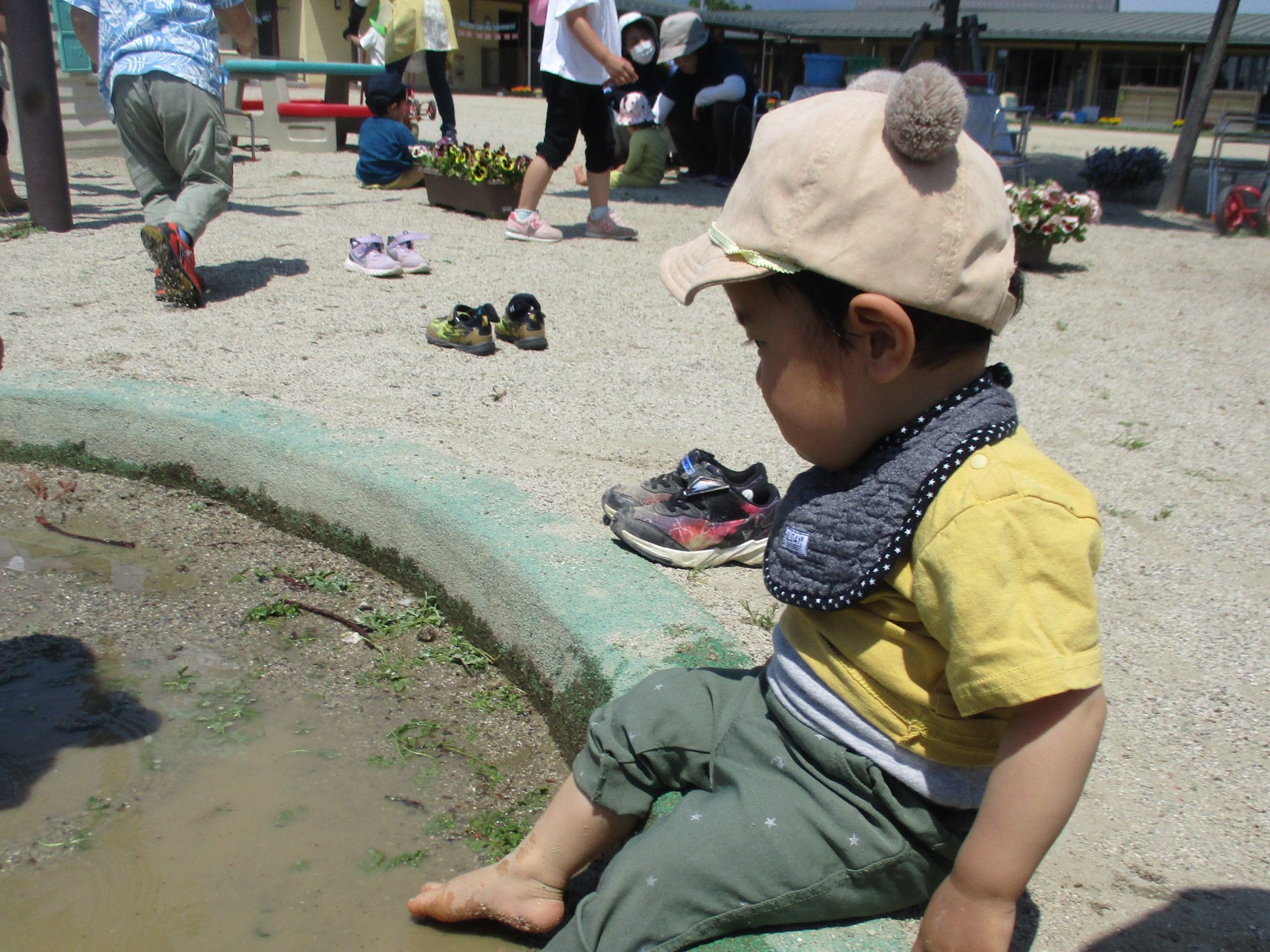 「裸足になって砂あそびしちゃおう!!」砂や水たまりに足をつけ感触を楽しみました。