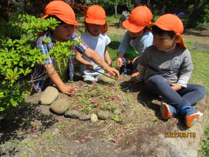 体を動かすことが好きな子、虫を探すことが好きな子、草花でおしゃれを楽しむことが好きな子、みんなそれぞれ好きなことは違いますが、一人一人が自由にのびのび遊んでいます。