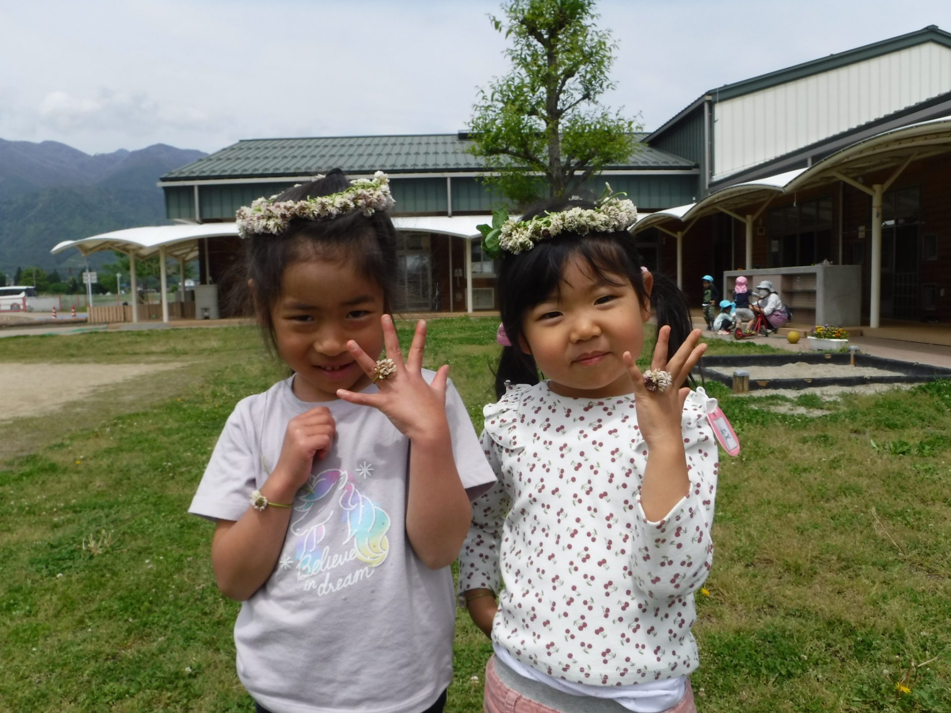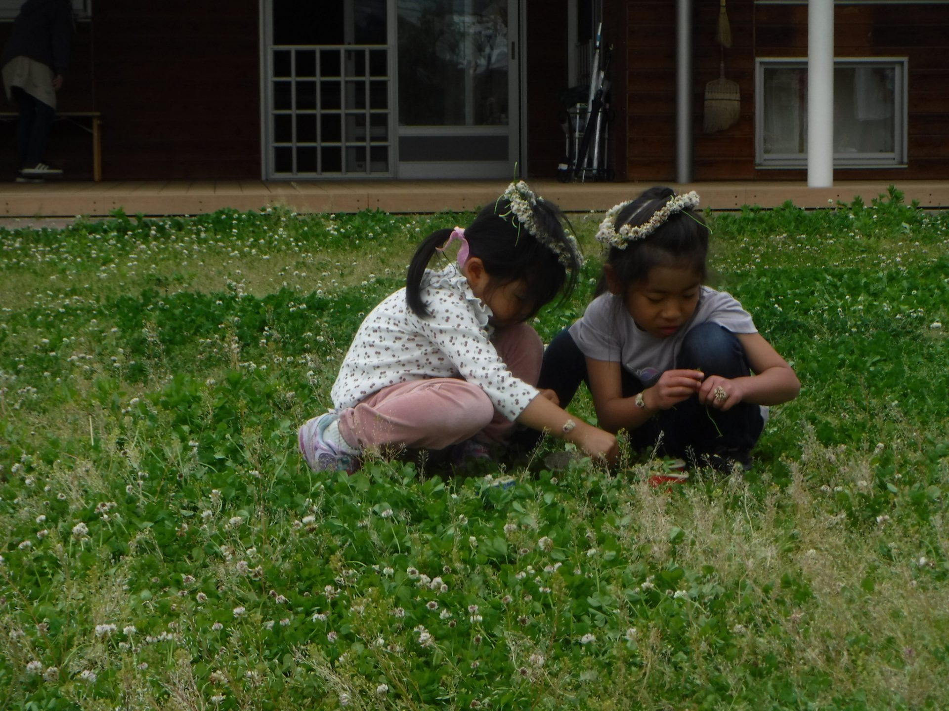 シロツメクサでかんむりを作り、おひめさまごっこ!
