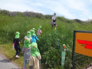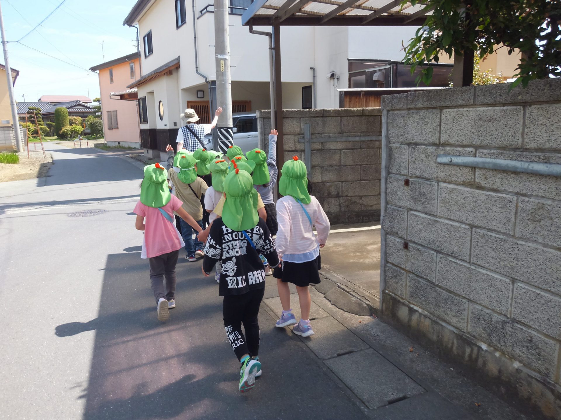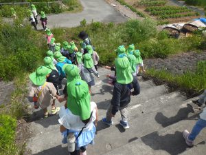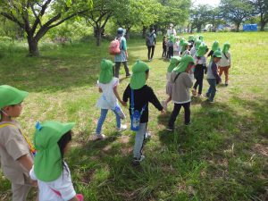 この日は年長クラス合同での散歩。少し遠い土手まで歩きます。