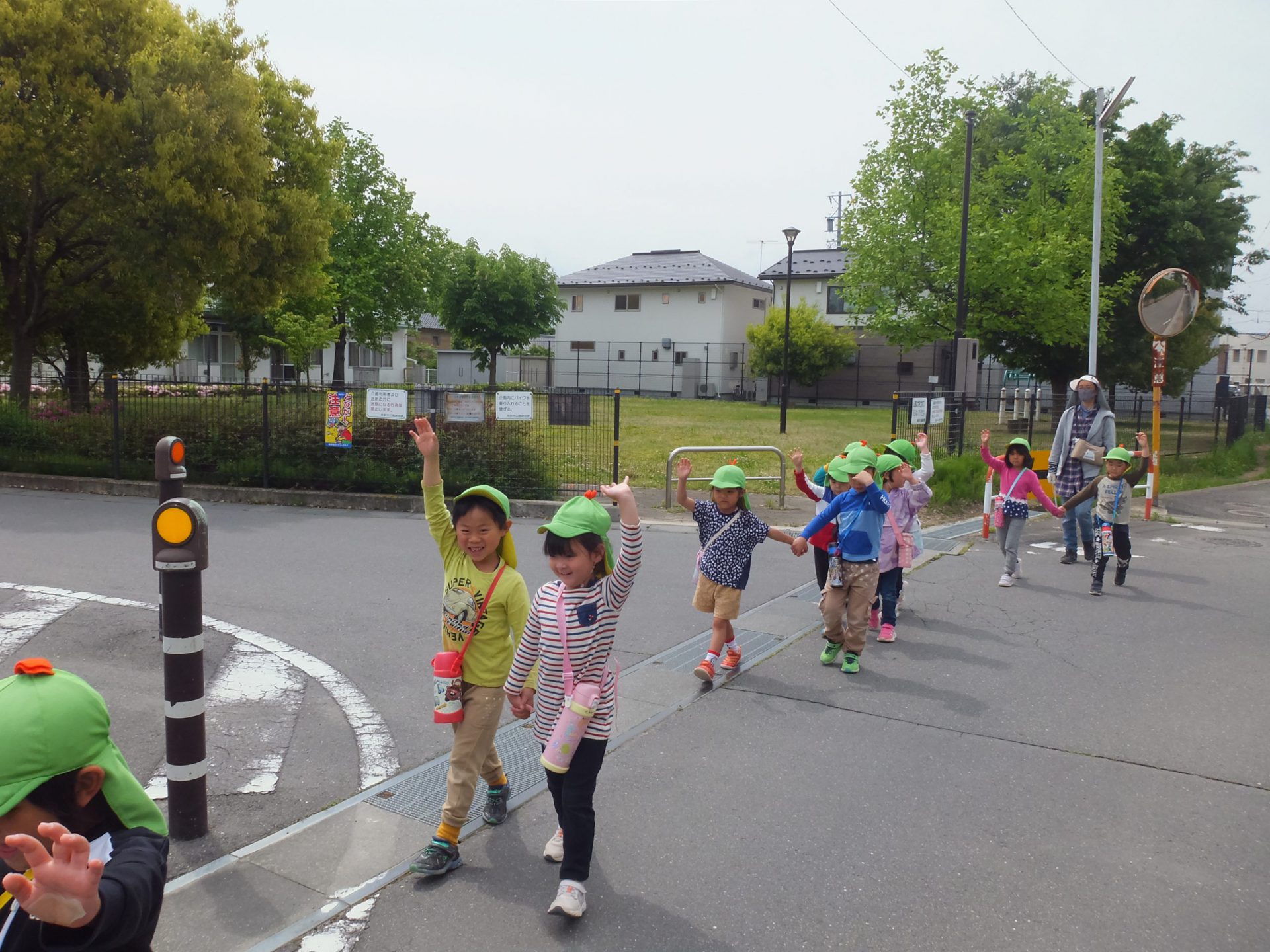 「手をまっすぐ挙げてー!」先日の交通安全教室で教えてもらったことを思い出しながら歩きます。