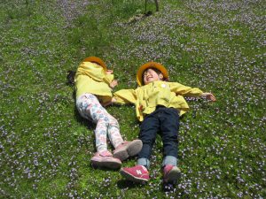 おなかいっぱいになり元気パワー全開!木の乗り物に乗ったり、見晴台に登ったり、芝生の坂を転げ回ったり、花のじゅうたんに寝転がったりと元気に楽しみます。