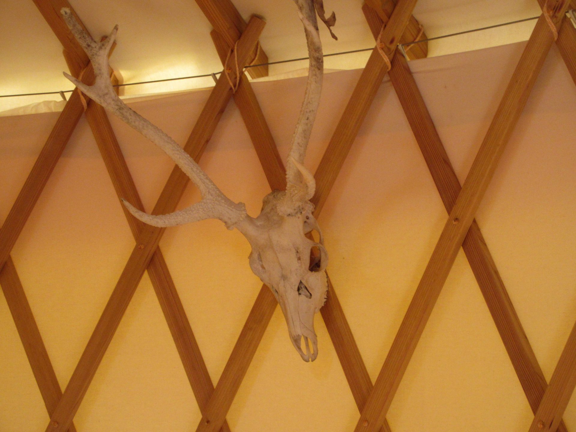 「わぁっ、骨だ!!」と驚き、鹿の骨が飾られているのを見てびっくりする子どもたち。