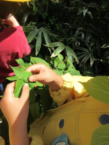 ノリウツギの葉を手に取り「葉っぱを引っ張ってごらん」と言われ引っ張ってみると「すごい!糸が出たー」と納豆のような糸が出てビックリ。
