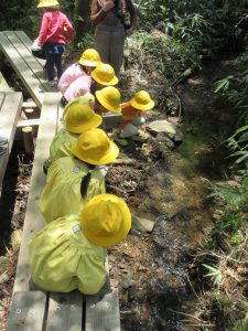 周りの景色を見ながら歩いて行くと、ちょうちょが飛んでいたり、川を流れる音が聞こえます。時折吹く風にタンポポの綿毛が舞います。その風景がとても神秘的で、子どもたちも「わぁ~」と思わず声を出します。