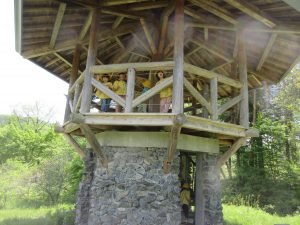 山のテラスに到着。一足早く到着した子は「がんばれー」とお友達を応援します。