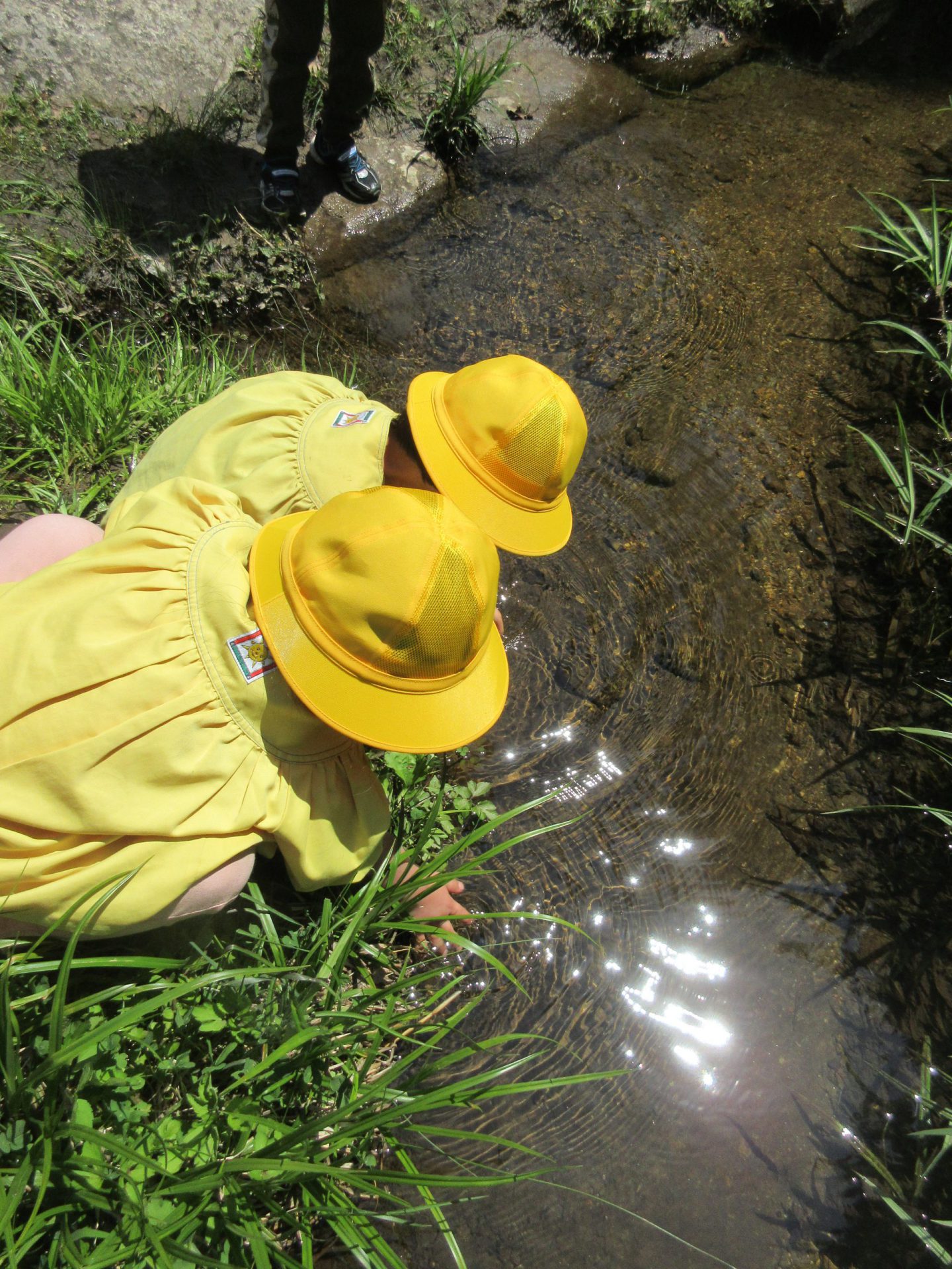 近くの川を覗くと、小さな魚がいっぱい。そんな中、見慣れない物を見つけて、「何かいる!」 「何、これ?」と興味津々。
