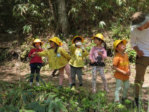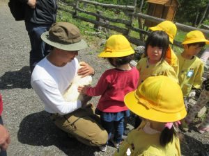 今度は山の散策です。「これ食べれるよ」と教わり笹の新芽をそっと引き抜き食べてみます。