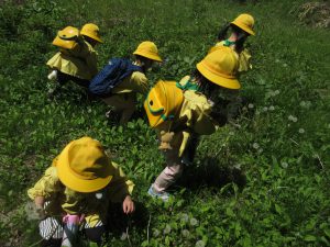 ・綿毛飛ばしや虫探し、広場での散策など、子どもたちは自分で遊びをどんどん見つけて楽しんでいきます。自然の中で何度も遊んでいるからこそ、保育士が遊びを提供しなくても楽しめる子どもの力に改めて良いものが育っているなぁと感じました。