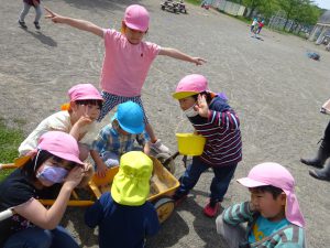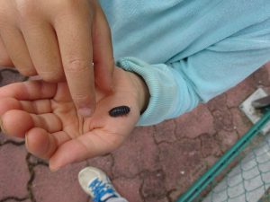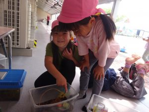 保育園の庭にはかねちょろ、ダンゴムシ、ミミズ、いもむし、かたつむりなどなどたくさんの生き物がいます。