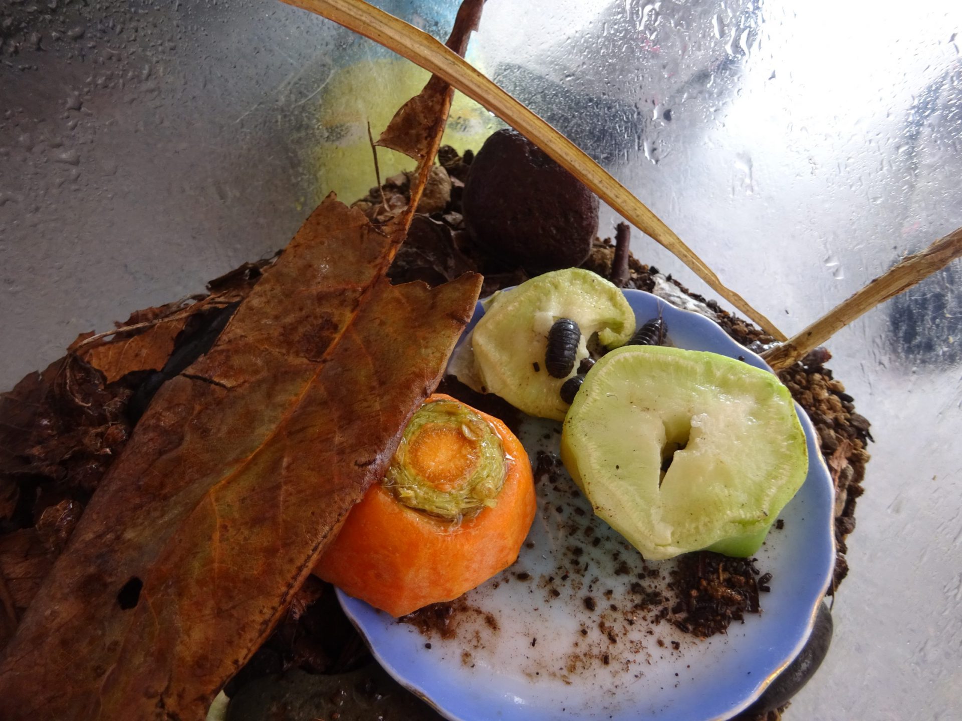 飼育ケースに土を入れ、落ち葉や石も入れ野菜のくずを餌にしました。毎日霧吹きで湿らせ、野菜を変えて世話をしています。