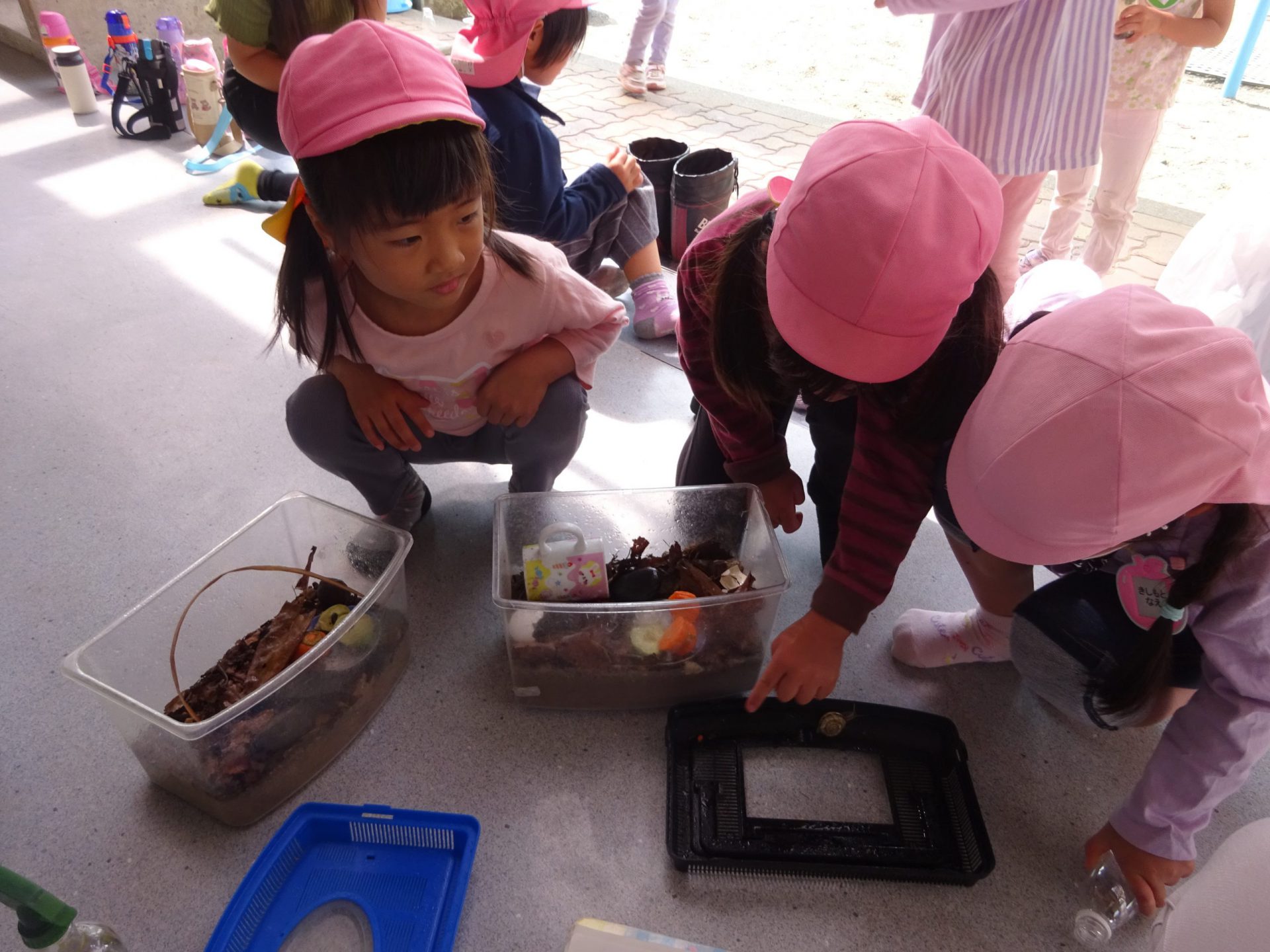 たくさんいました。小さい友達も年長さんの捕まえたダンゴムシを見たり触ったり、興味津々。