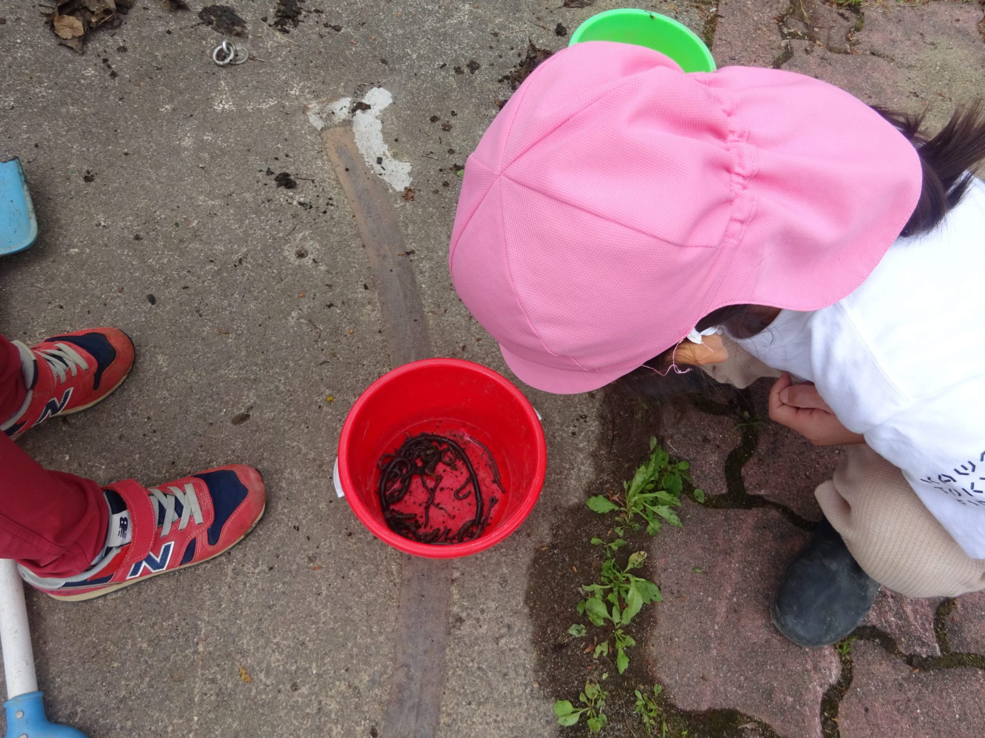 大きなミミズを発見!キャーと歓声を上げながら捕まえていました。みんなで見つけたミミズをバケツに集めると、たくさんのミミズが集まり、子ども達もびっくり!でした。