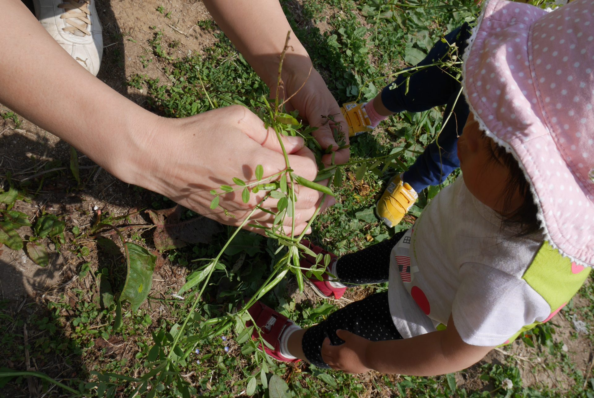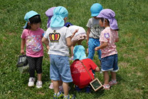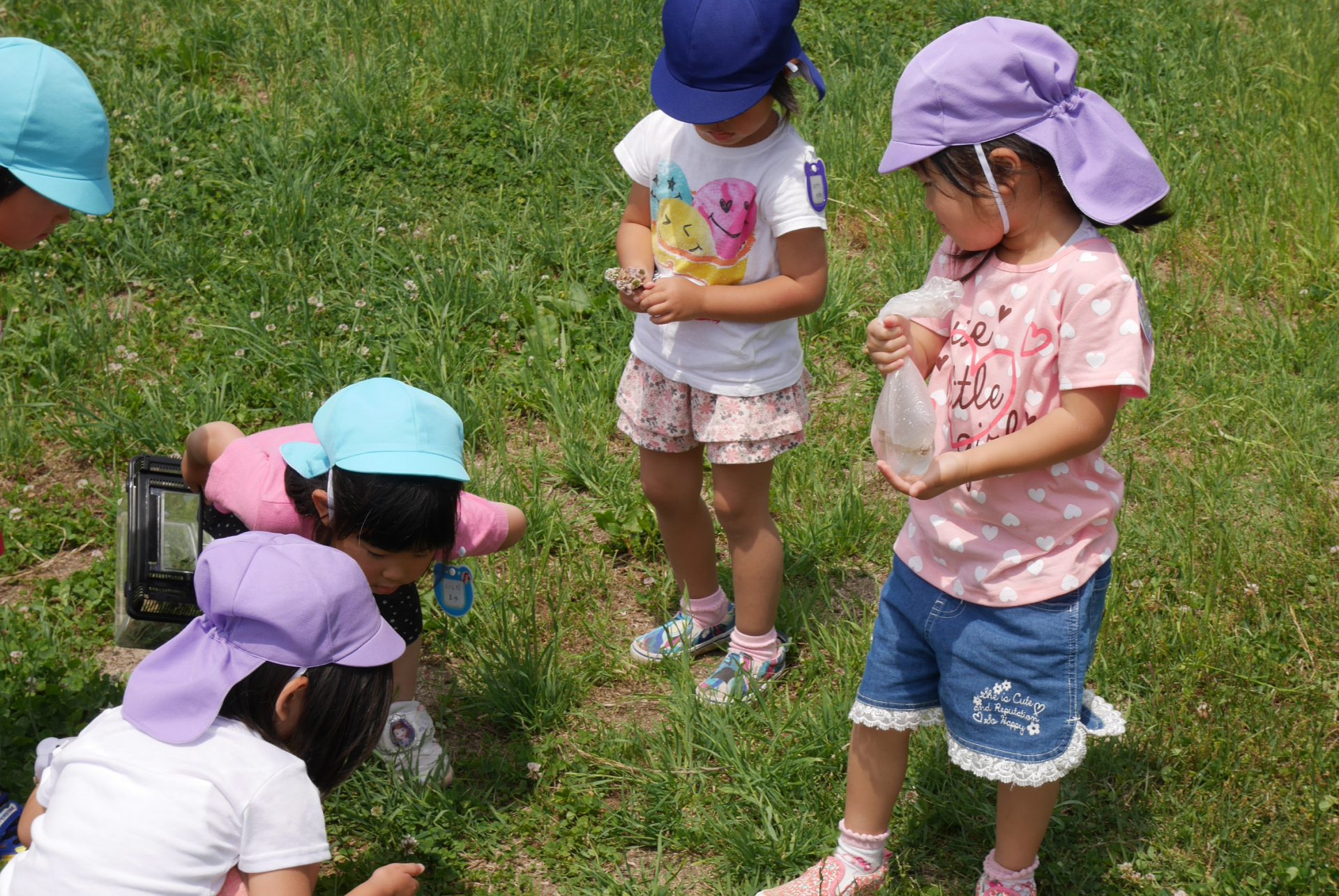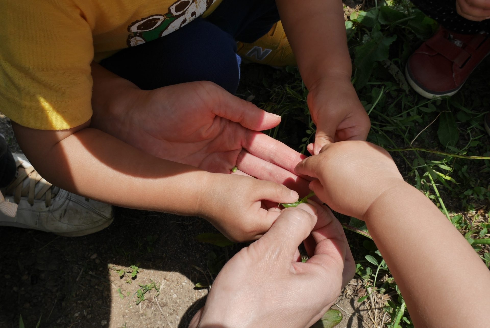 保育室の前ではキュウリやトマトが大きくなるのを楽しみに水をあげたり触ってみたり、「きゅりのいぼいぼが痛いね」と気づいた年中児。花びらから不思議な色が出て素敵な色に驚く姿があります。未満児さんも「まめまめ」とサヤから出てくる豆を何度も取って先生に見せていました。園庭の小高い草むらの中でテントウムシ探し、テントウムシの棲んでいる所もちゃんと知っていました。