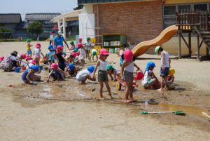 年長さんは今日は思い切りどろんこ遊びです。お昼になるまでうんと遊ぼうね。