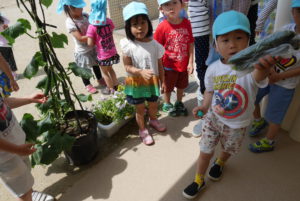 今日はいい天気、毎日園庭の様子は少しずつ変わります。「今日はキュウリ採れたね」地域の方にいただいたプランターの野菜が収穫できました。