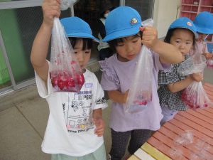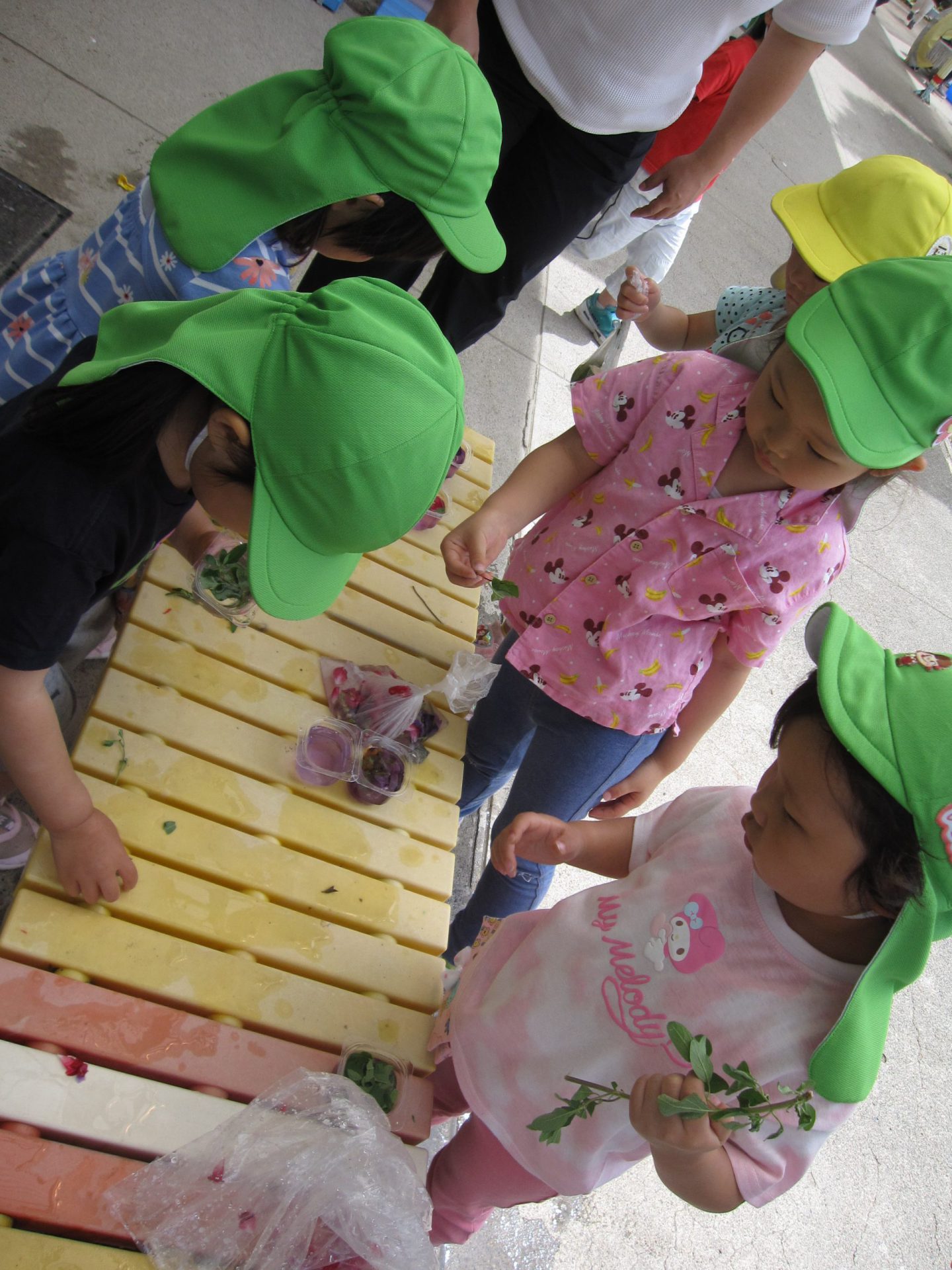 翌日、登園するとすぐに3歳児・4歳児が袋を持って色水あそびに使うだろうと思われる花を選んでいました。そうそう、それが大事。それが大事。大きい組さんから教えてもらったあそびで興味があることは、すぐにでもやってみたくなります。花をすぐ採らず、よーく見て選び納得した花びらを摘んでいた小さい組さん。その姿を見た時に、昨日、5歳児が小さい組さんに得意気に色水伝授をしていた姿がここに繋がっているなと感じました。