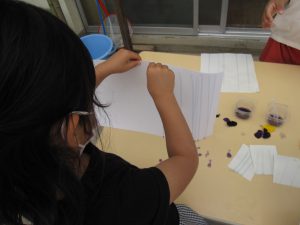 「黄色の花びらで茶色の色水ができた!色水で絵をかいたら、青になってる!!」