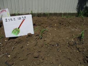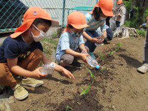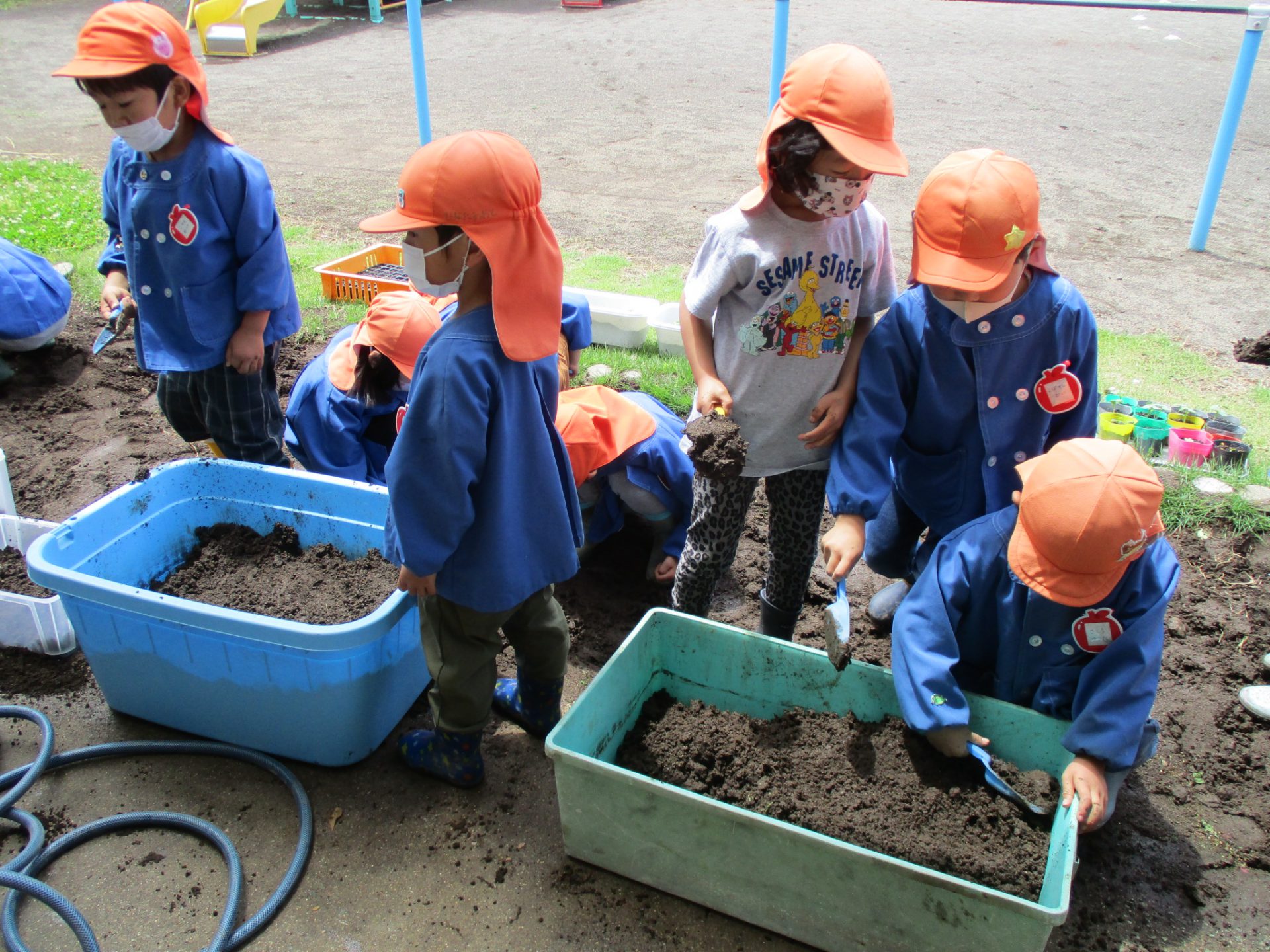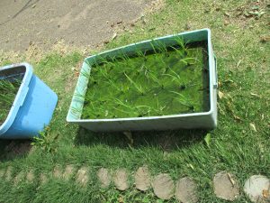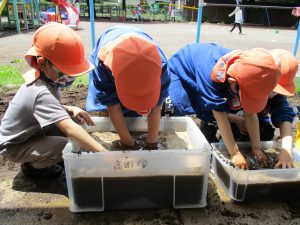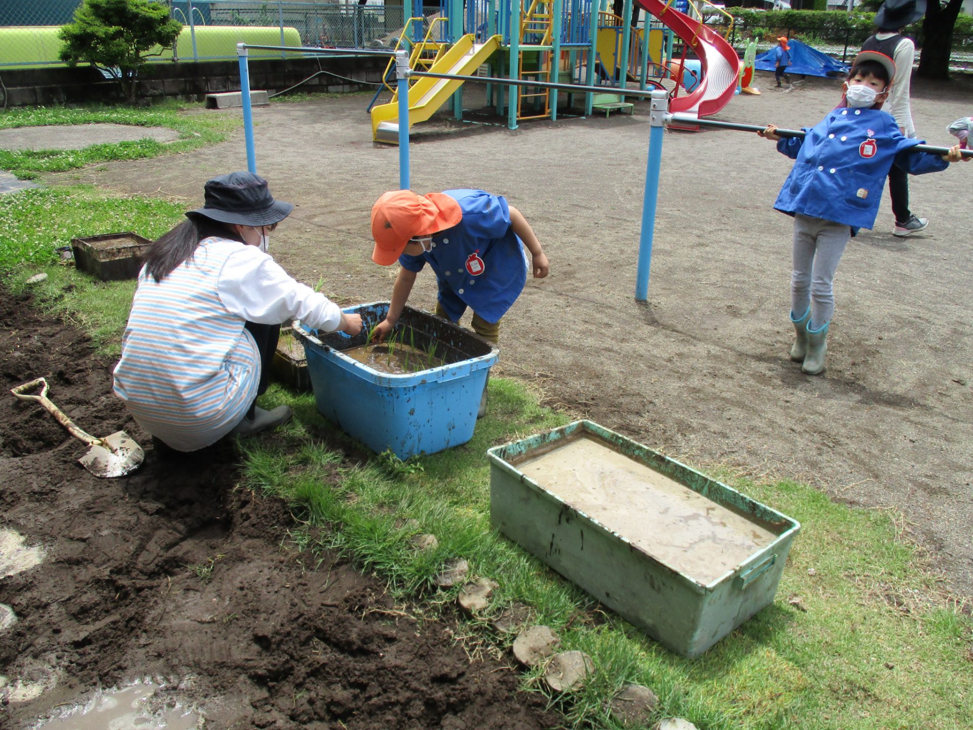 腕も服も泥だらけにして混ぜて作ったミニ田んぼ。