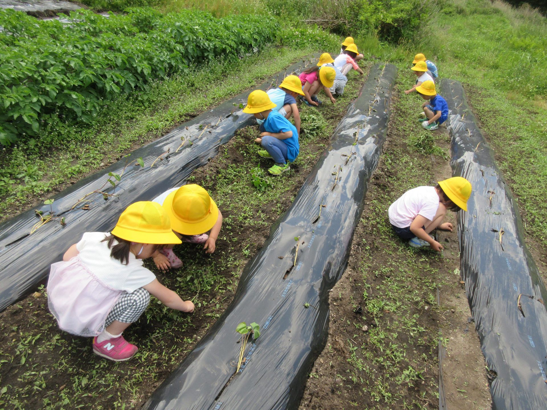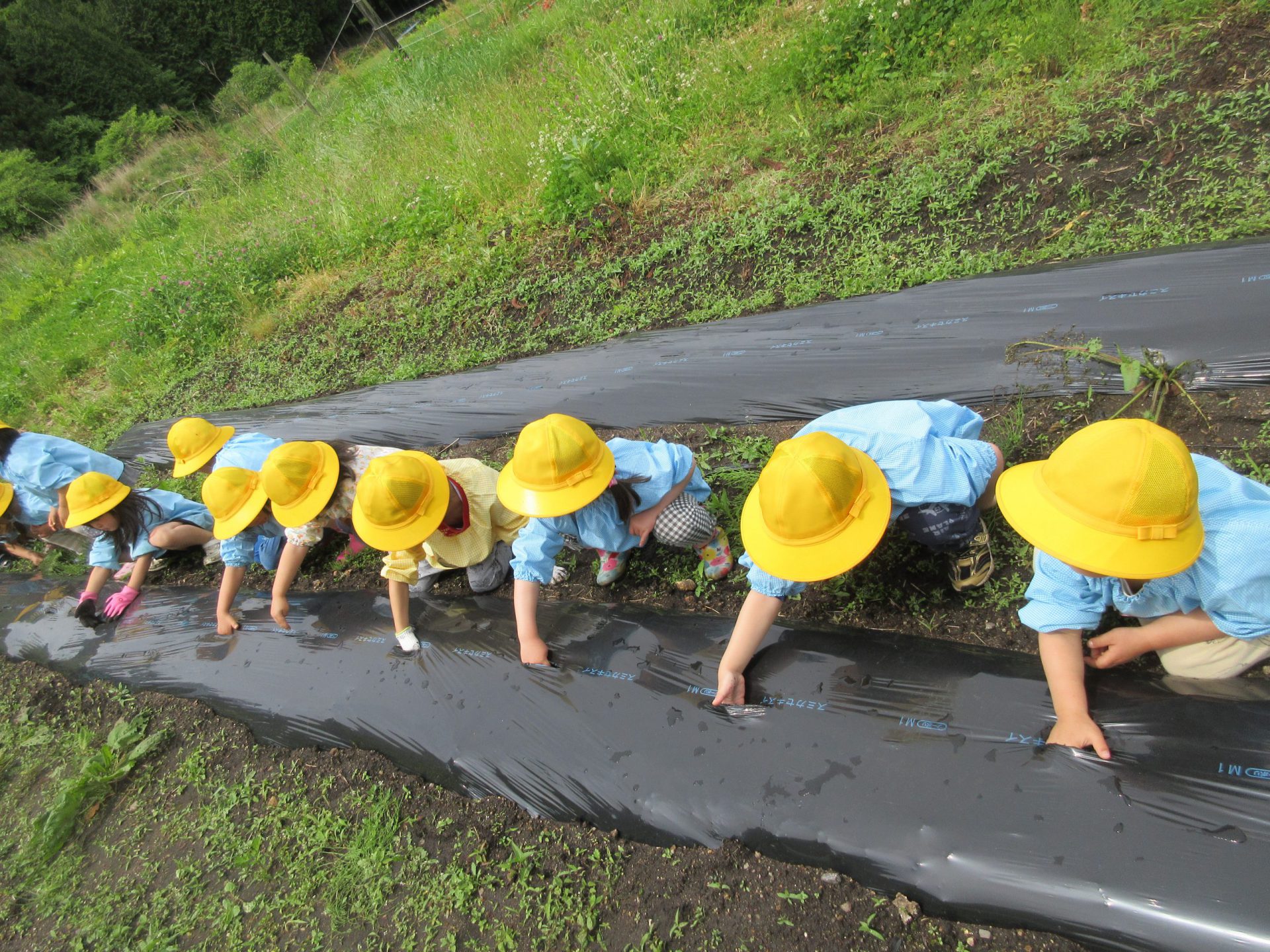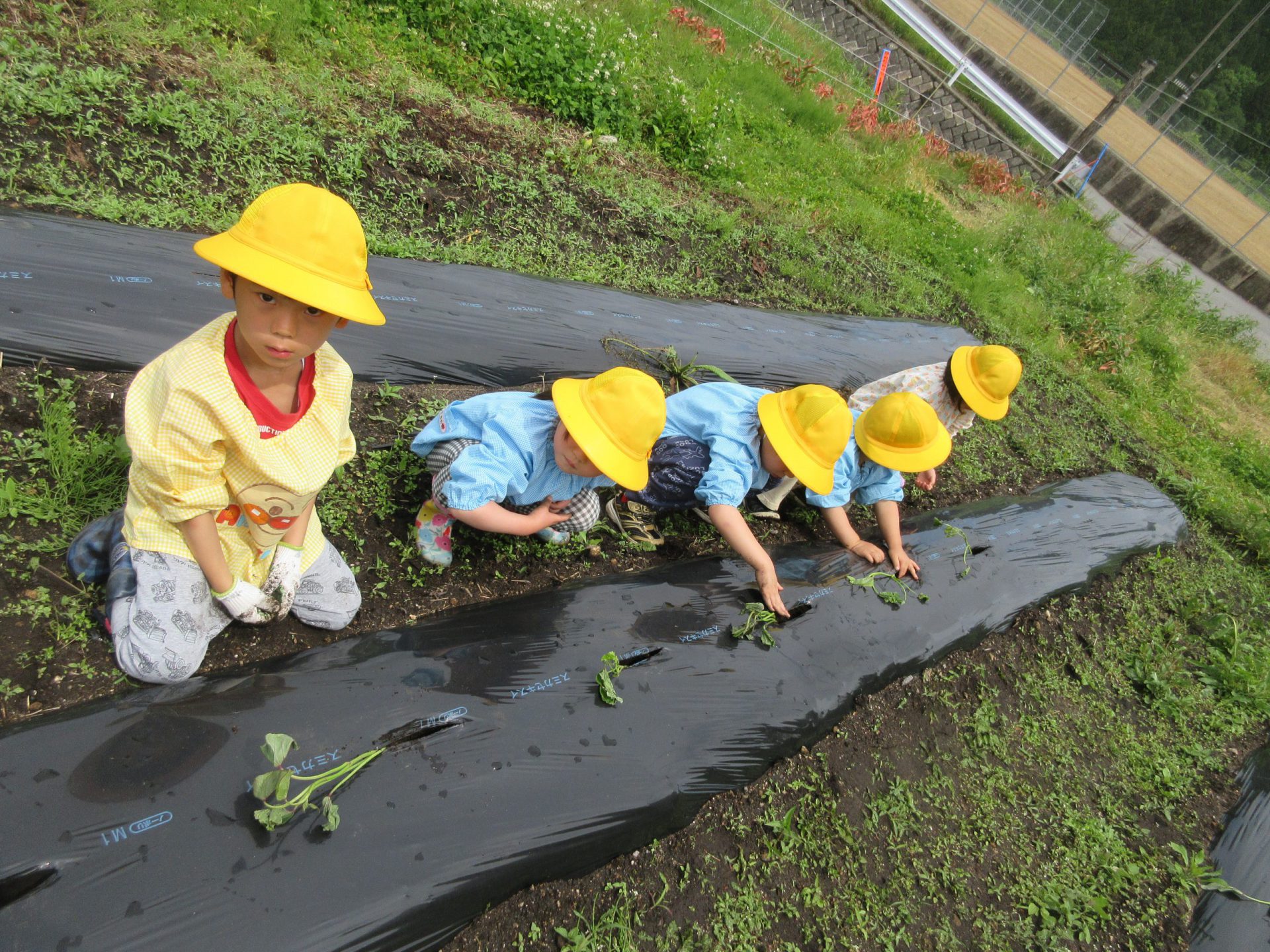 3歳児・4歳児がポップコーンの苗植え、5歳児もさつまいもの生長を見に森沢の畑に行ってきました。
