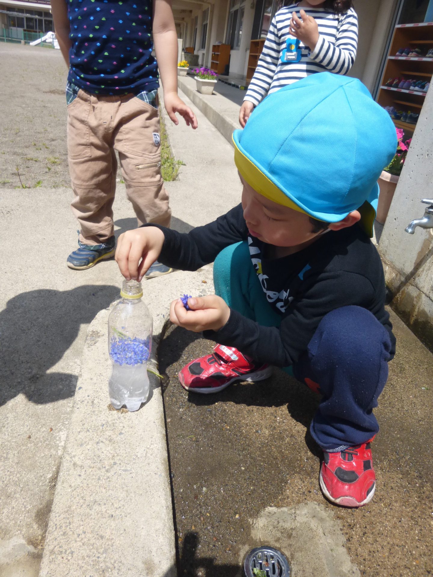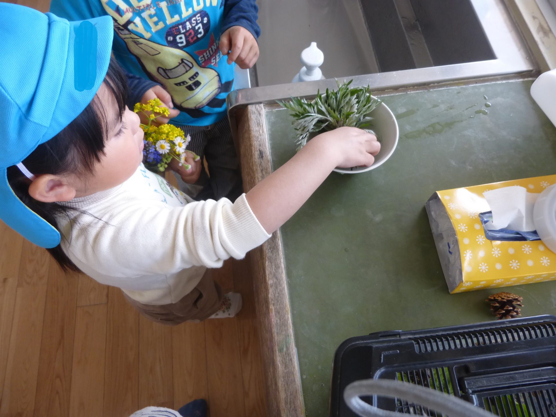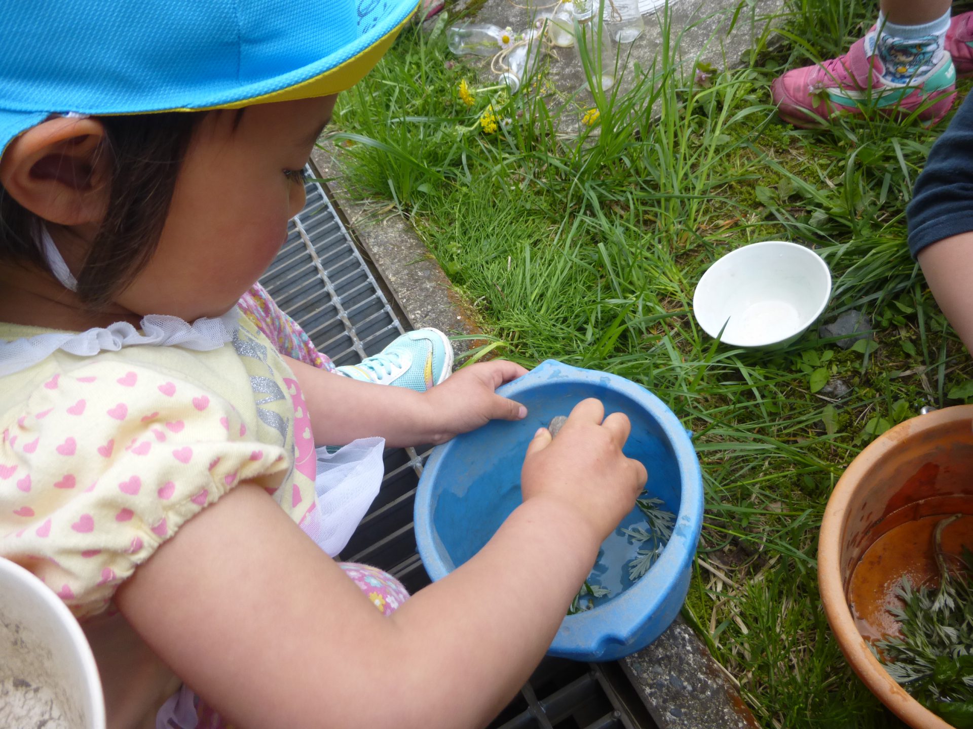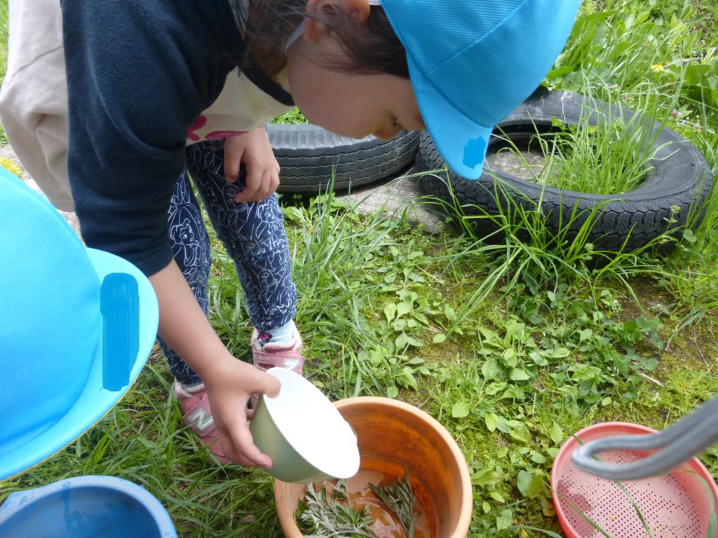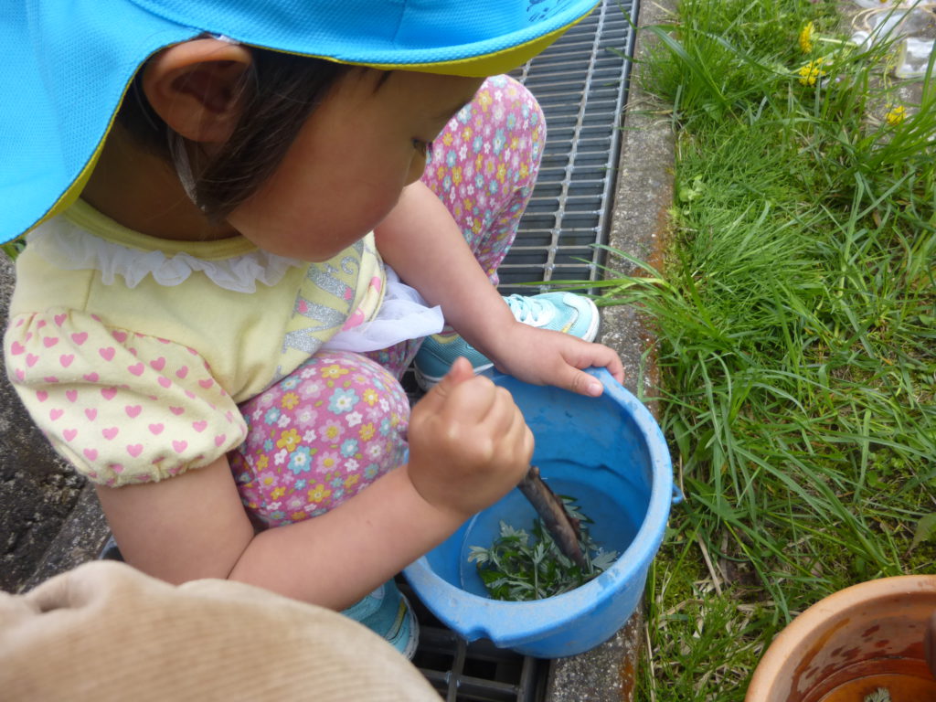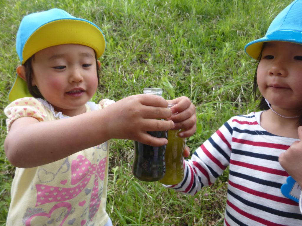 さらに、花をつぶして色水を作ったり、実をそのまま入れたりと色水遊びが盛りあがりジュースやさんに発展しています。
