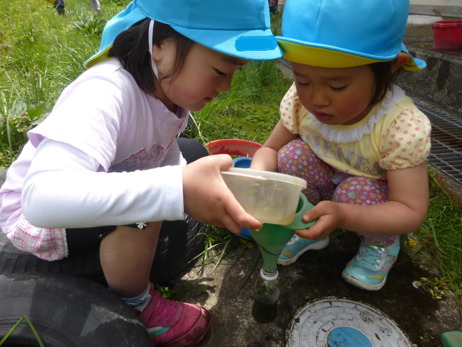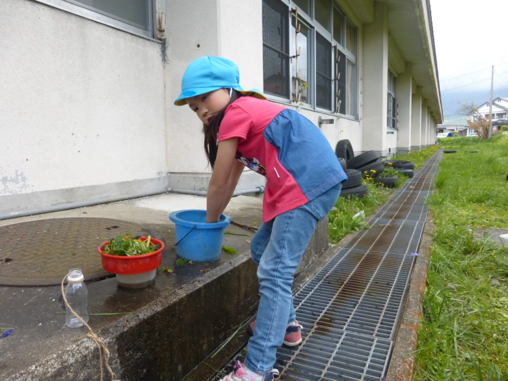 ごしごしとよもぎを擦りいよいよペットボトルに移します。バケツをのぞいても色がよくわからないので子ども達はドキドキです。