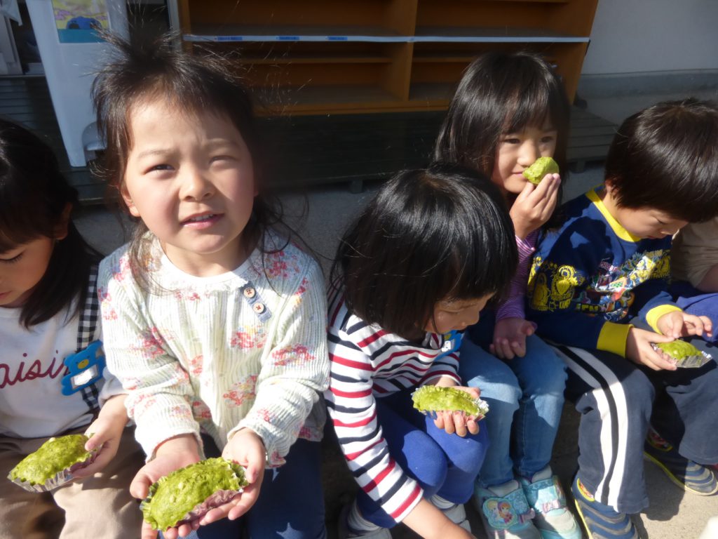 みなさん、お気づきでしょうか・・・?そうです。なぜかよもぎがおやつの日は外が良いようで、はりきって外へ出て行く子ども達です。