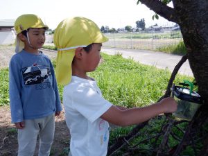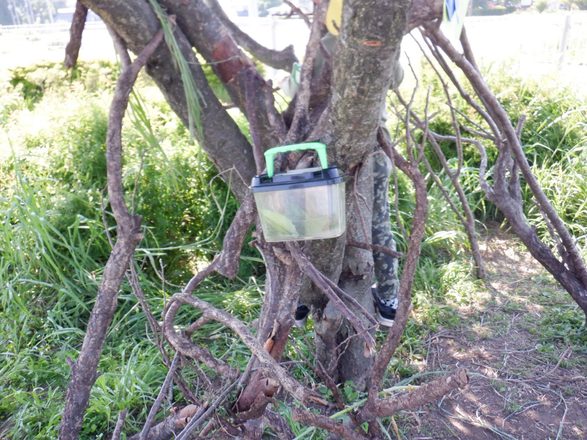 「虫も探すから、ここに虫かごをかけよう!」