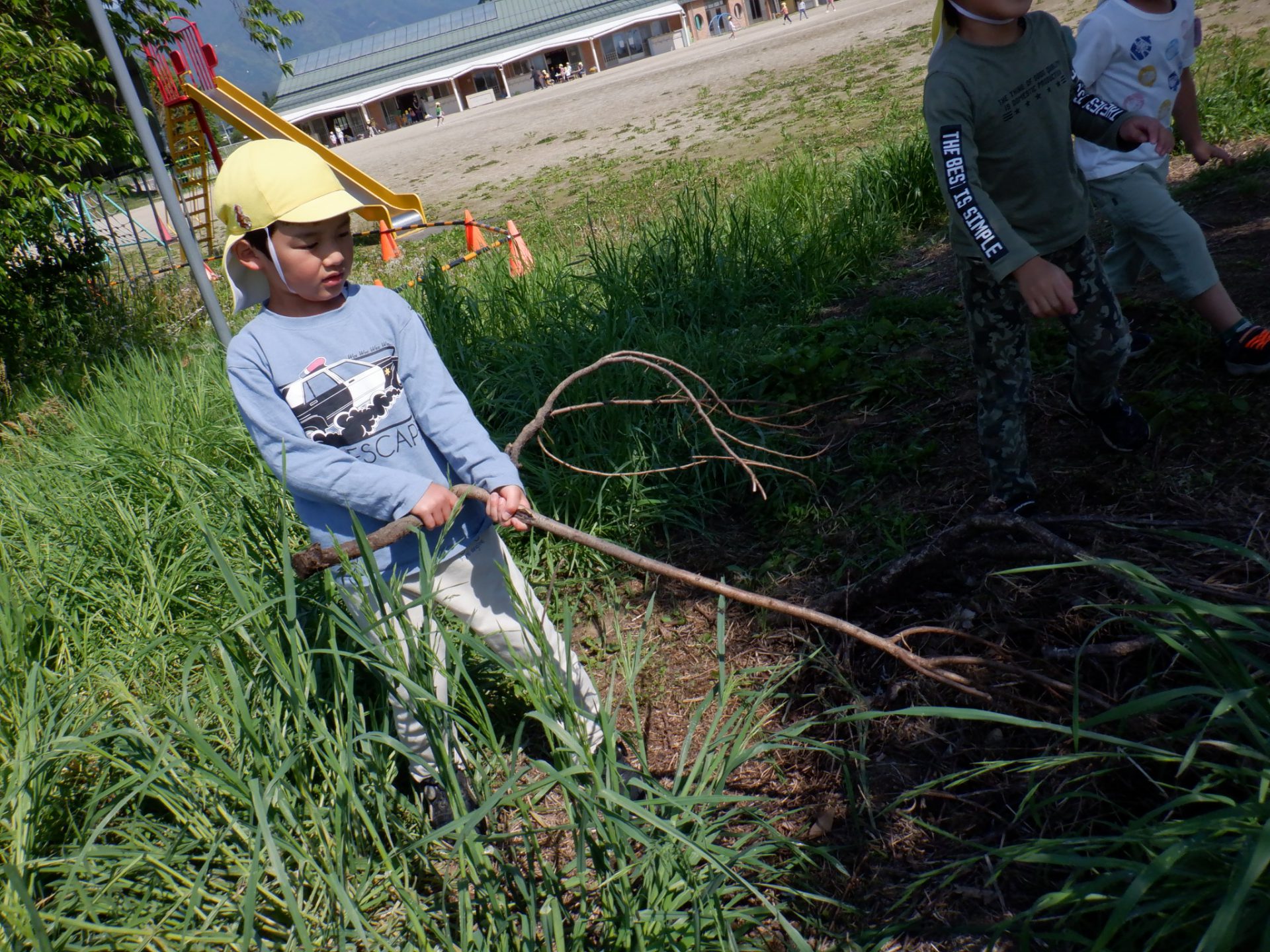 選定された木の枝を見つけた数人の男の子たちが、その枝を使って遊び始めました。