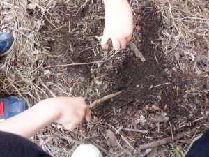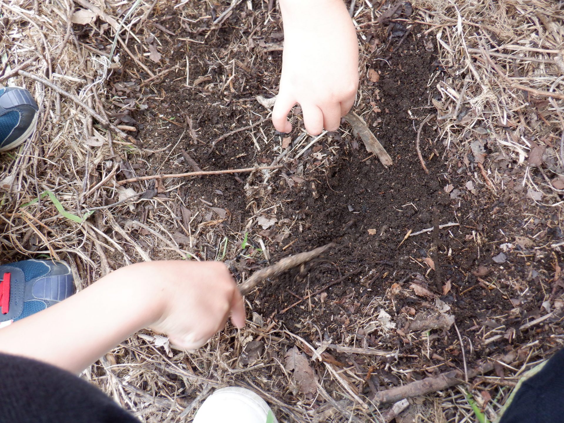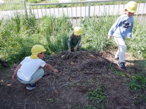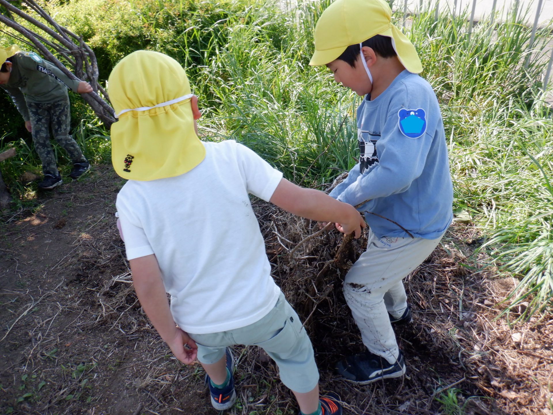大きな木の枝を持ち上げている姿に「ケガをしたらどうしよう。止めるべきか。」と考え不安でしたが、目をキラキラさせながら友だちと相談し作っている姿を見て、見守ろうと思いました。