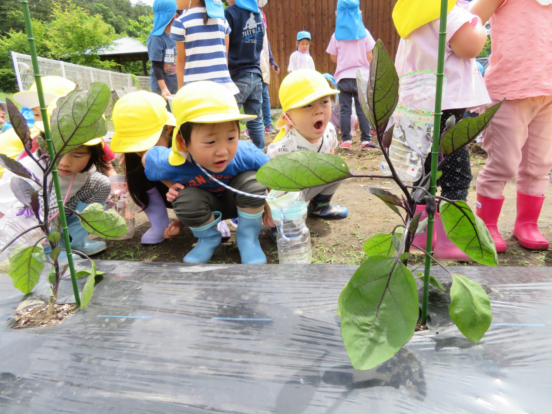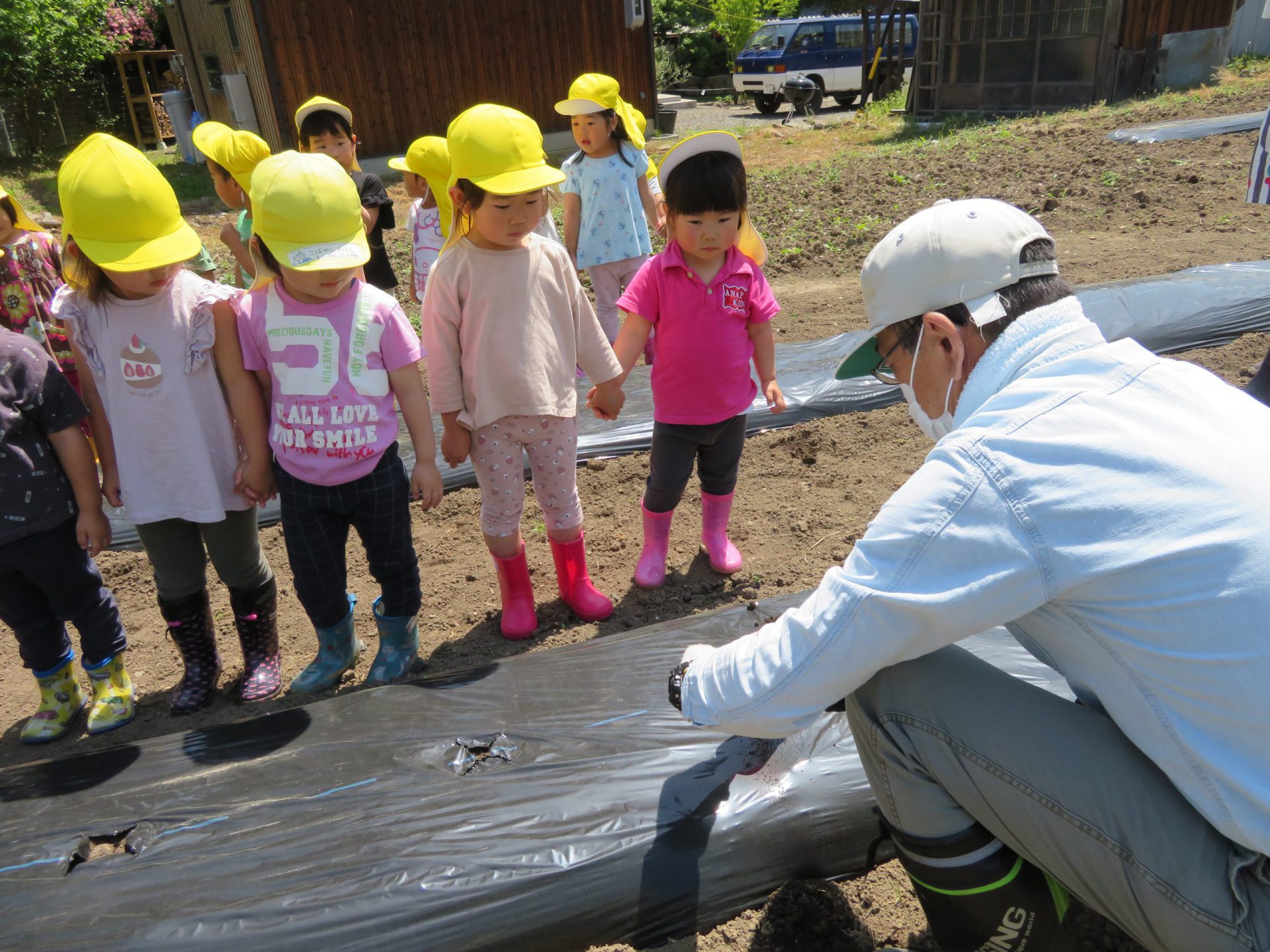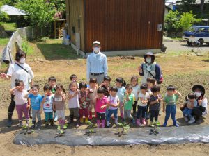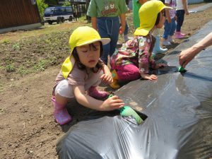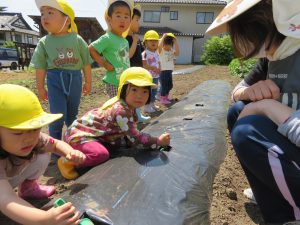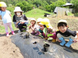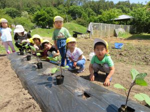 五月晴れに恵まれた日、3歳児 21名は、あおきっ子広場横の畑で夏野菜のミニトマトとナス、モロッコいんげんをこみ先生に植え方を教えてもらいながら植えました。