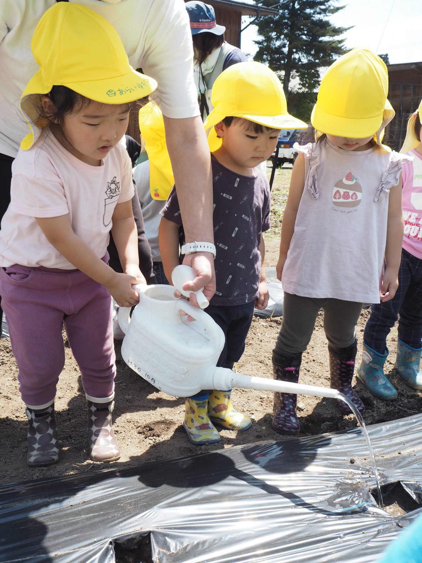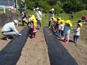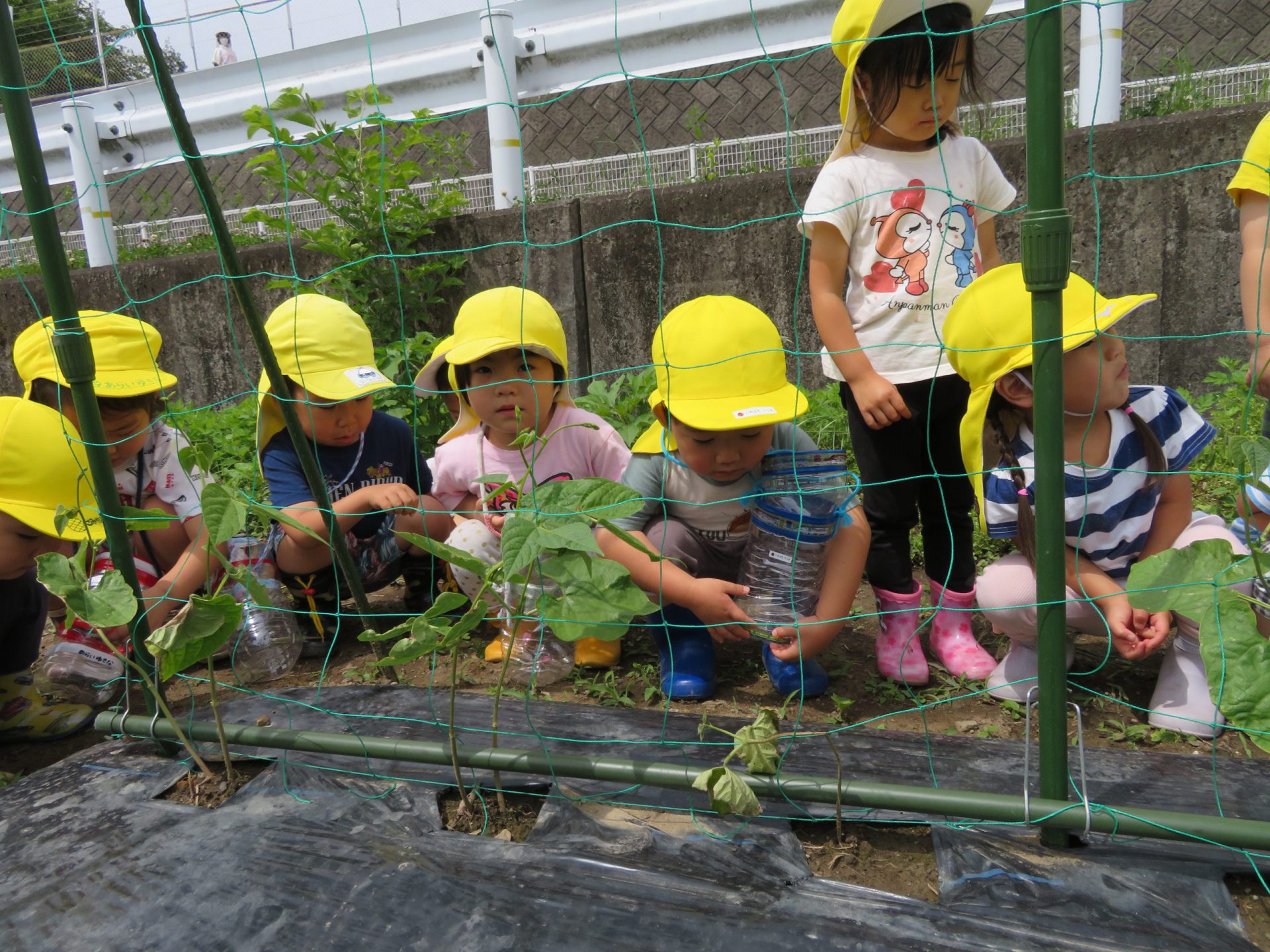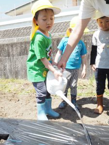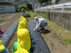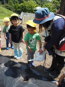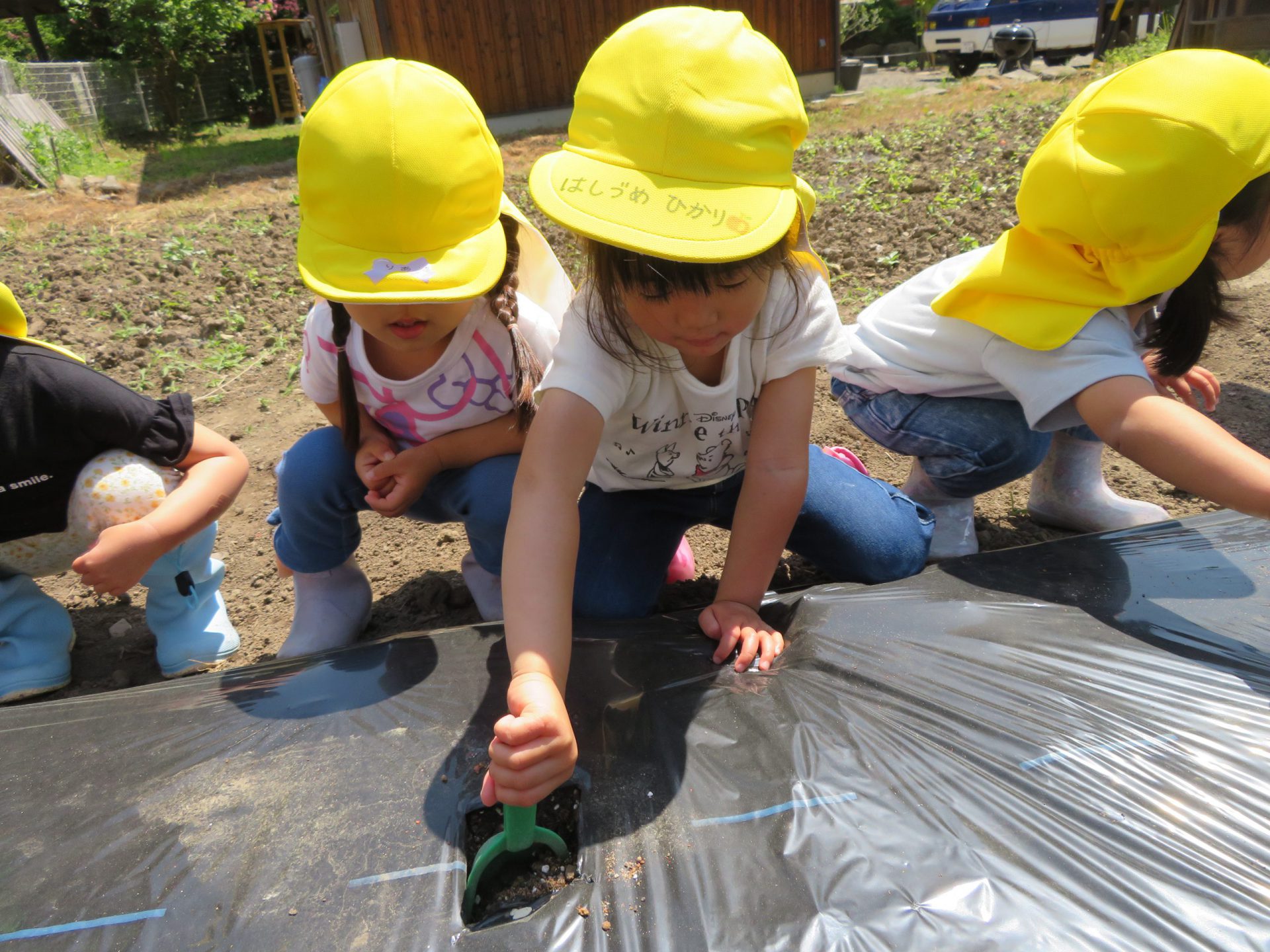 五月晴れに恵まれた日、3歳児 21名は、あおきっ子広場横の畑で夏野菜のミニトマトとナス、モロッコいんげんをこみ先生に植え方を教えてもらいながら植えました。
