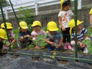 広場に遊びに行く度に、野菜の成長を楽しみに観察している子どもたち。