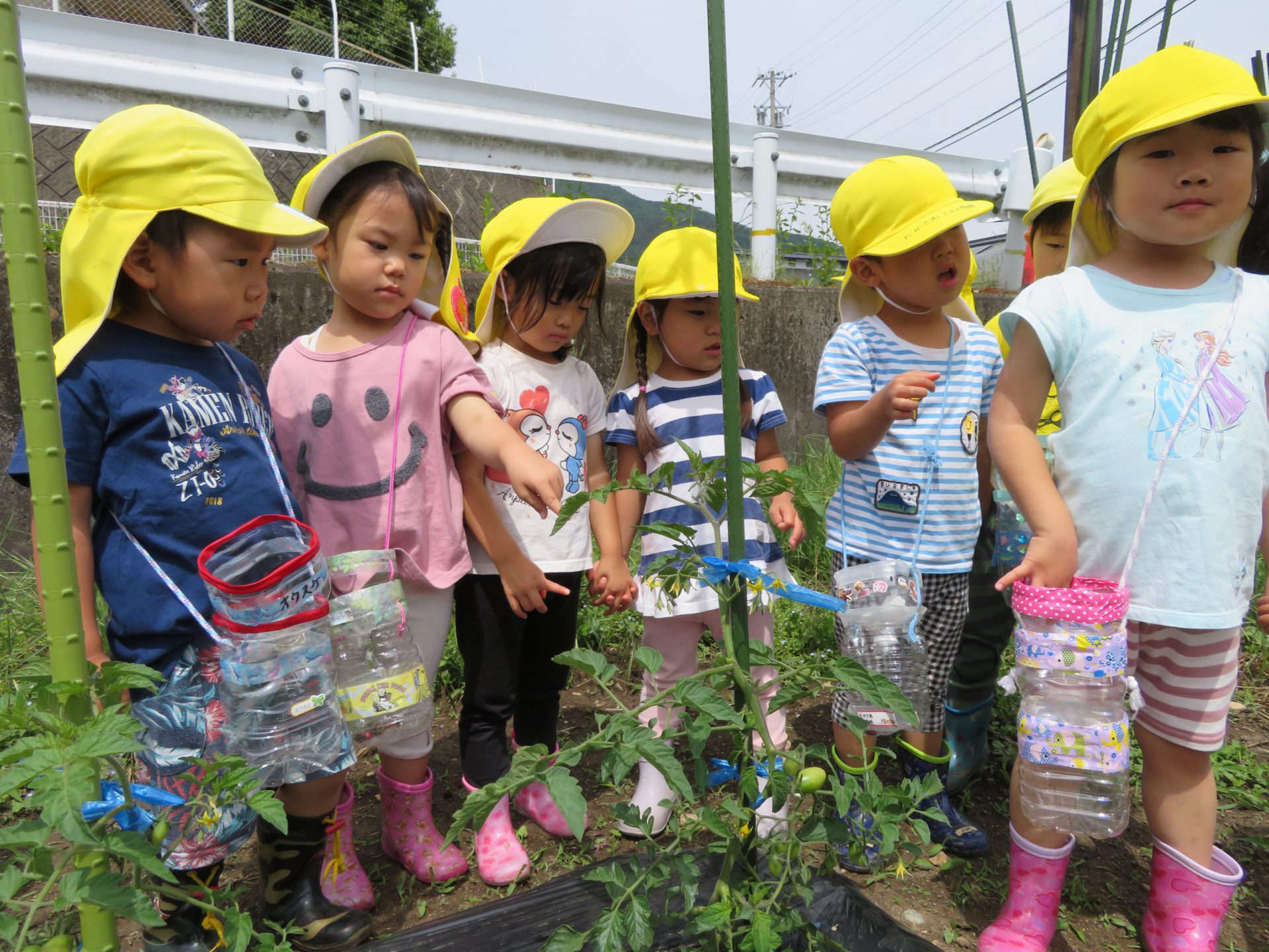 トマトの苗を見ると「ちっちゃいのなってるよ」「ほんとだ」「みどりいろだよ」「きいろいはっぱもある」と色や形等、様子をしっかりと見ていました。