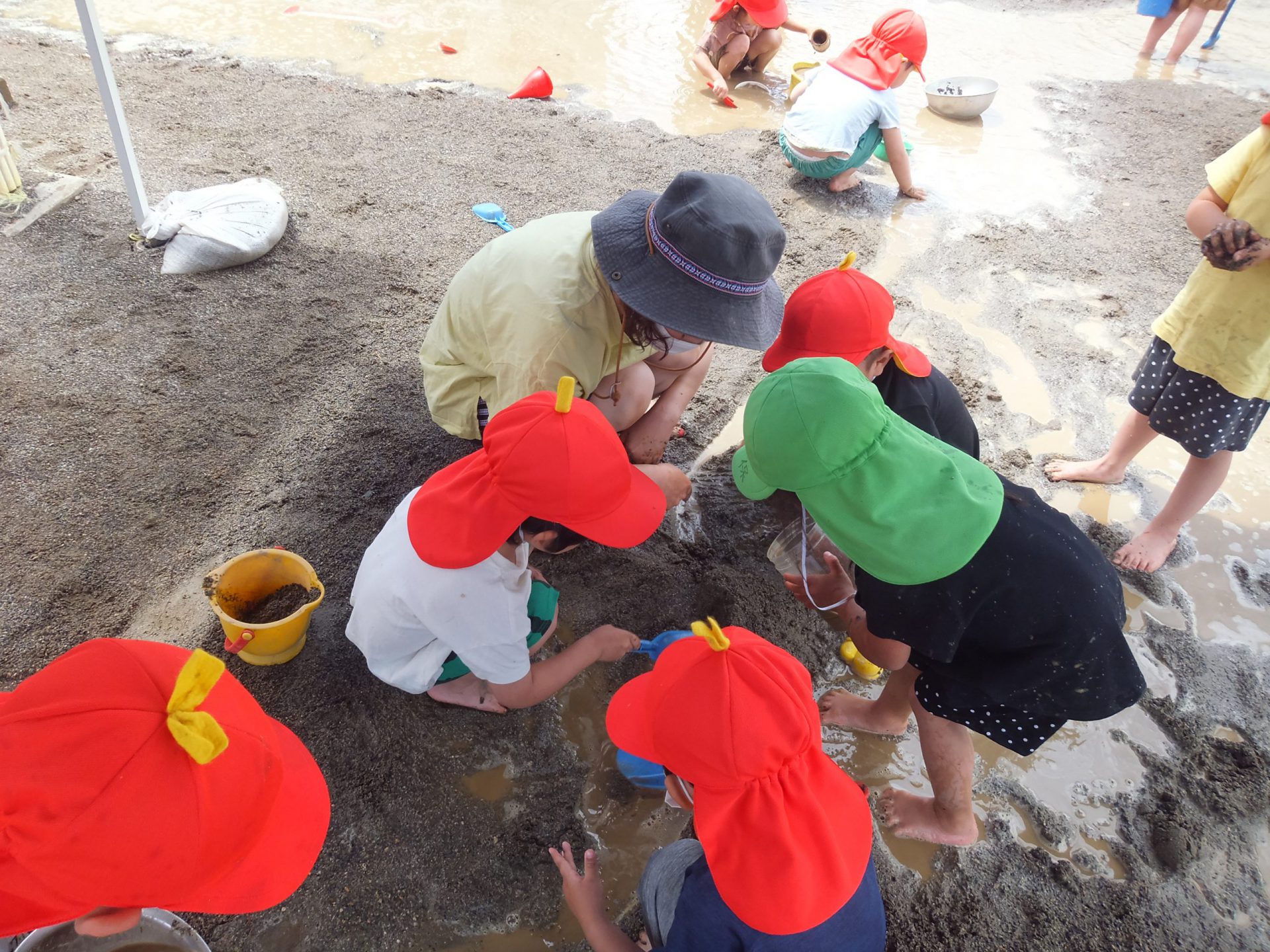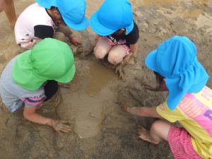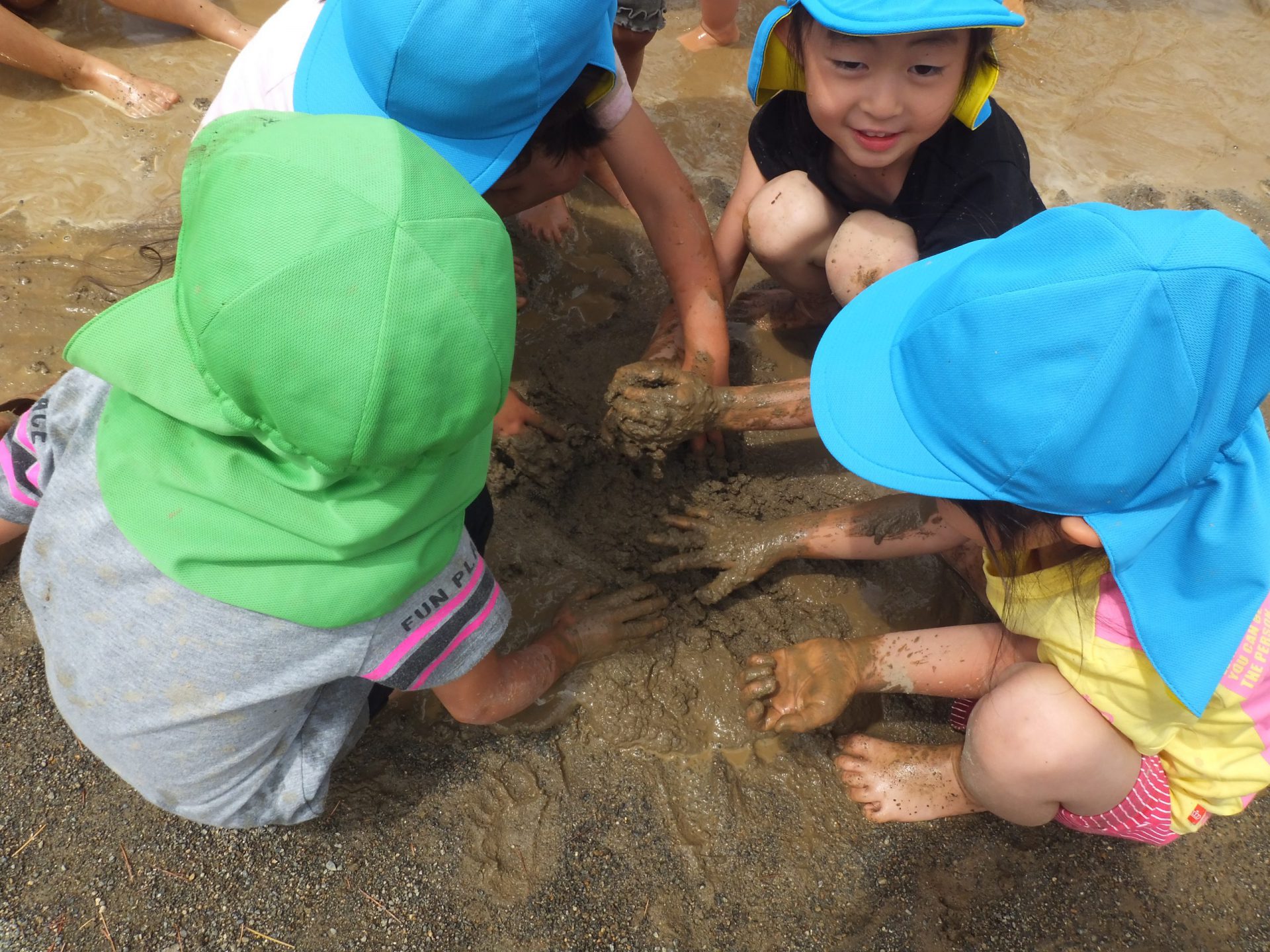 泥んこデビューしたての子は、無理なく少しずつ裸足に慣れて、砂や泥の感触に慣れていかれればいいなと思います。