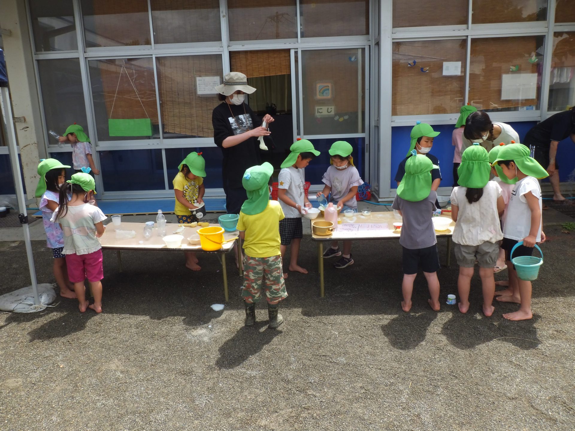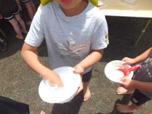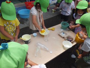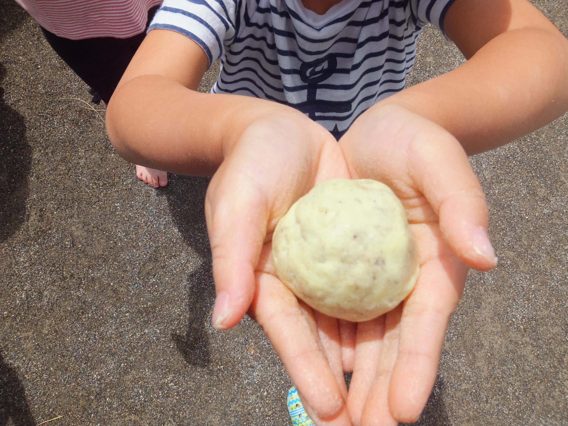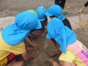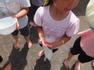 こちらは、泡づくりのようです。「シャベルでうまくできなかったから、手で泡を作っているの」