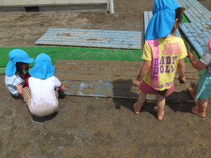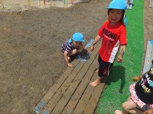 昨年遊んだ経験からか、水たまりにすっかり浸かる子もいました。水の感触を楽しんでいるようです。