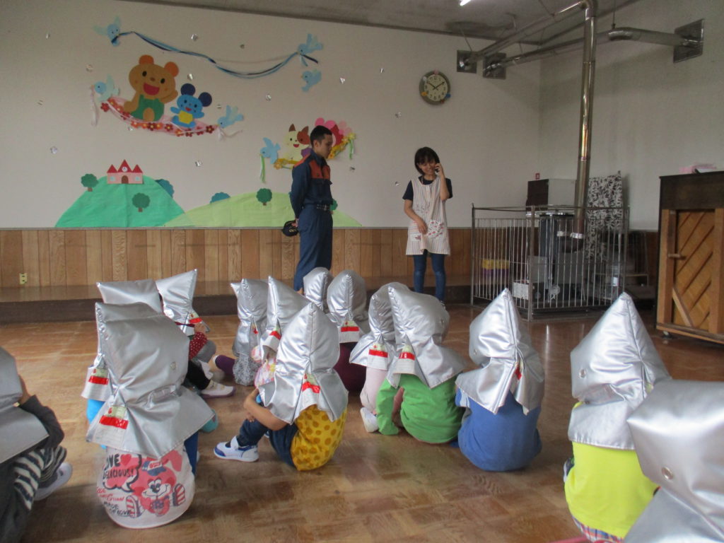 園では月に1度、発生内容を変えながら避難訓練を行っています。内容には地震・火災・不審者への対応に加え、降園時におけるひきとり訓練があります。防火教室では地域の消防署である信濃町分署の消防士の方にご協力いただき、園・保護者・消防署(地域)と連携しながら子どもたちを守っていきたいと思っています。