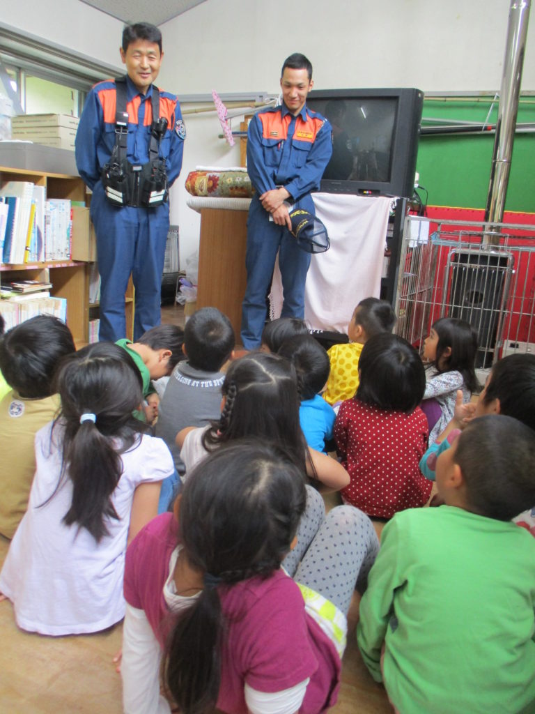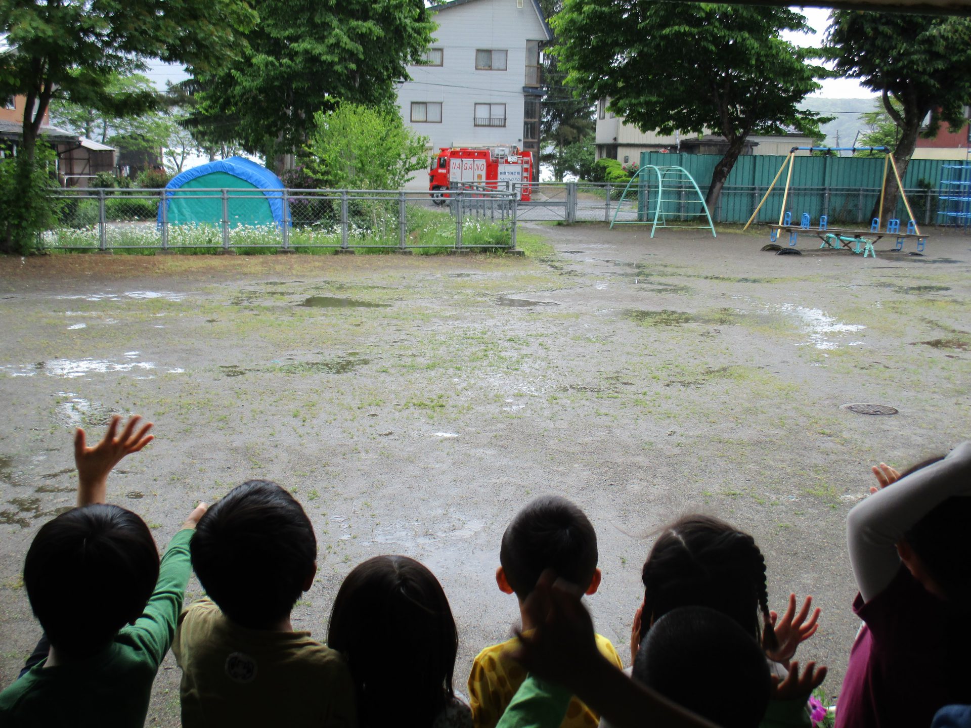「いつ、消防士さん来るの?」「消防車に早く乗りたいな・・・」とお友だち。