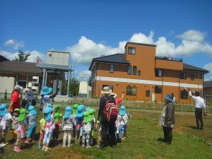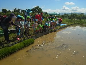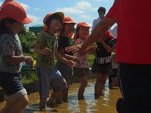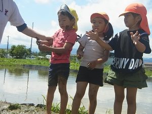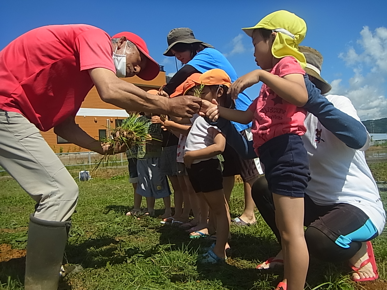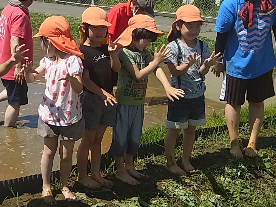 そこへ今日もやってきました3.4歳児さん達。「ふ~ん、これがたんぼ?」そして振り返ればミールケアさんに手を振ってさようならです。