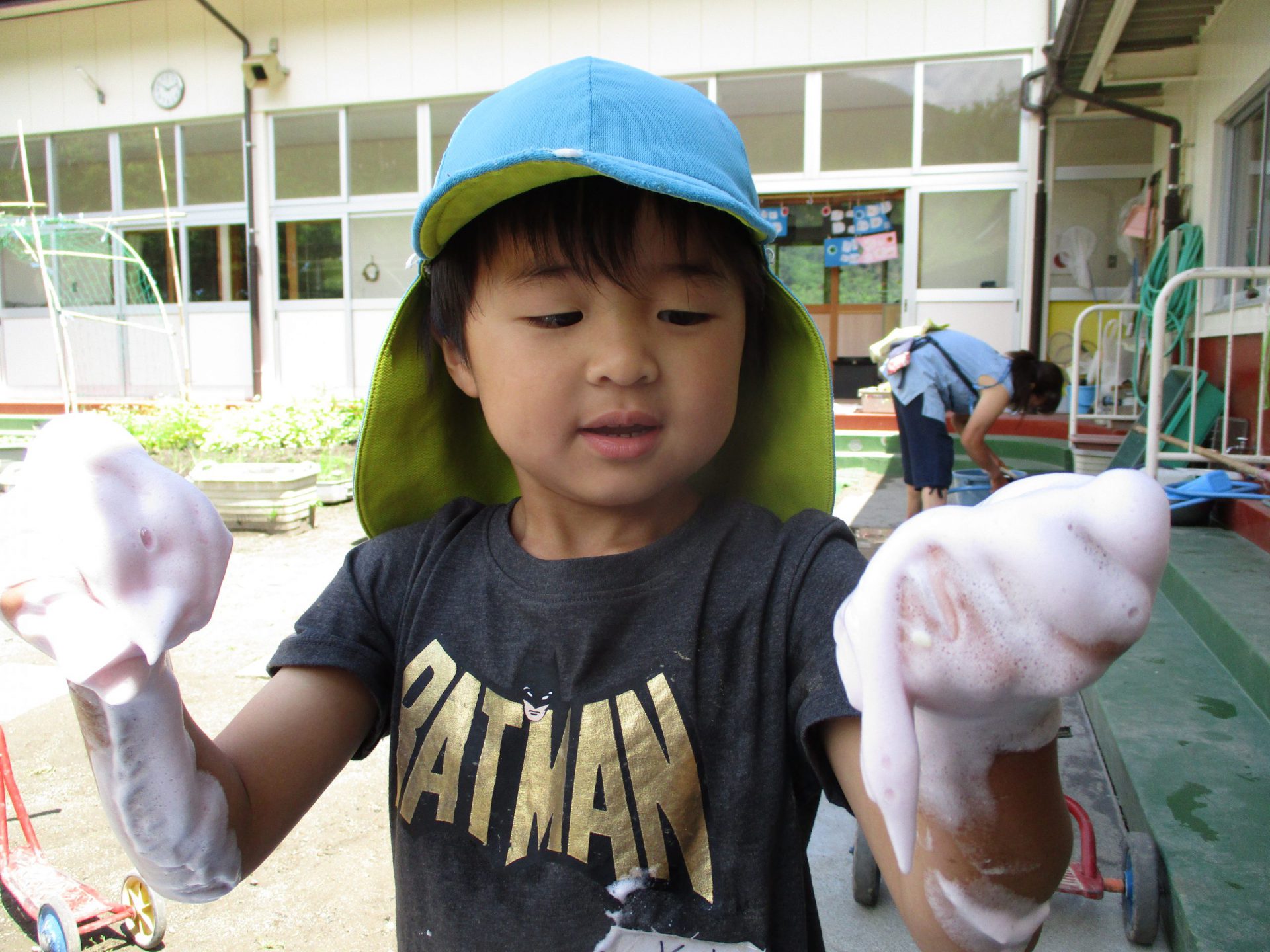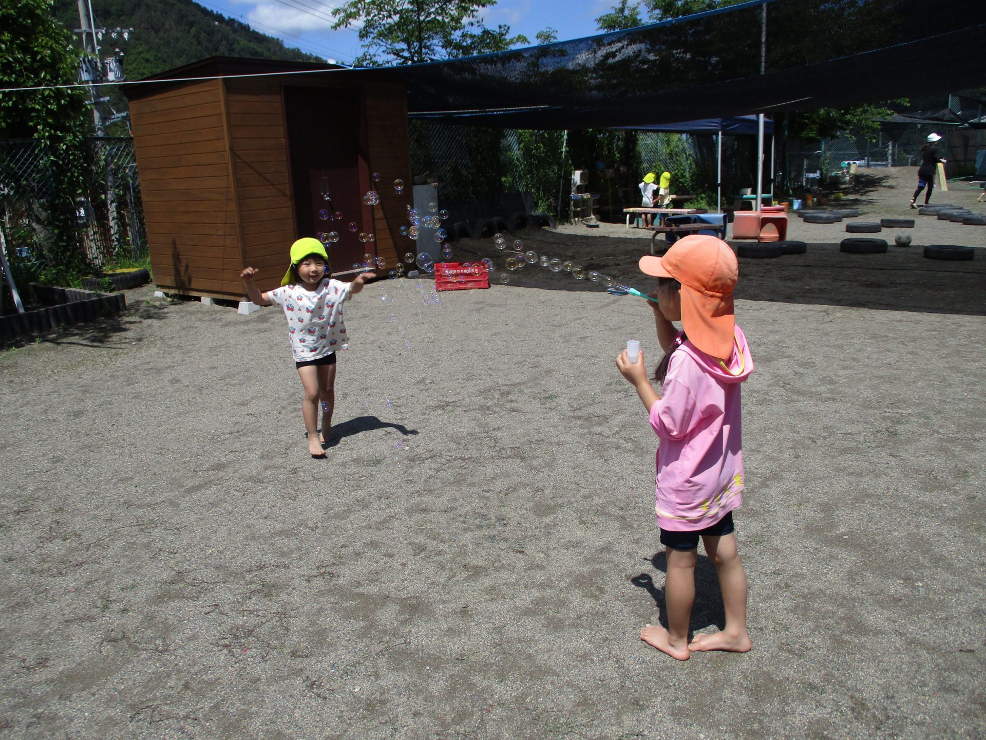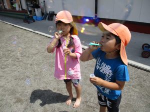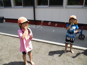 そーっと吹くと こんなにたくさんシャボン玉出るんだよ~(年長さん)