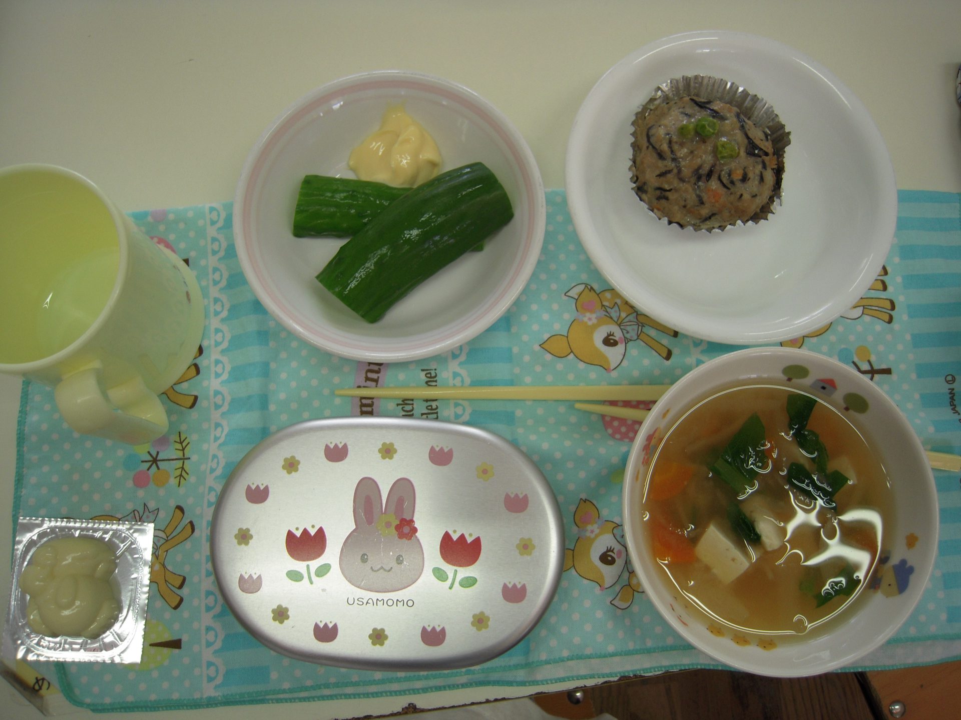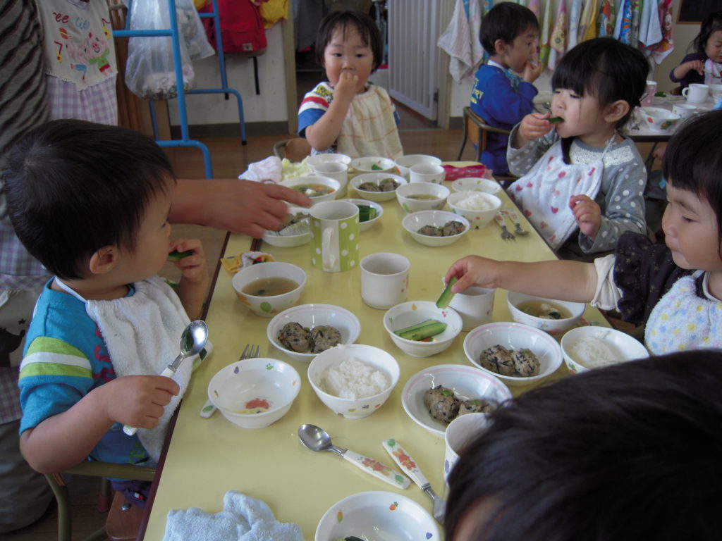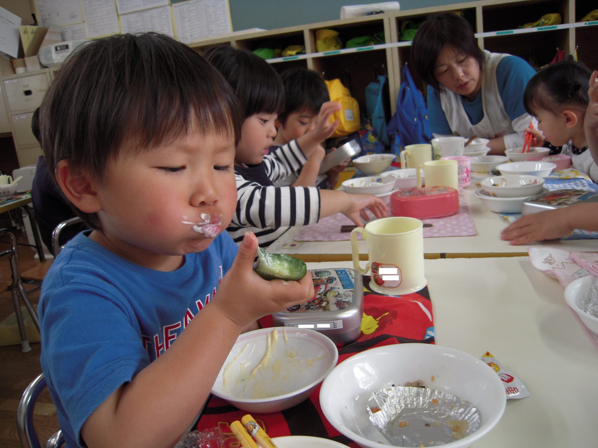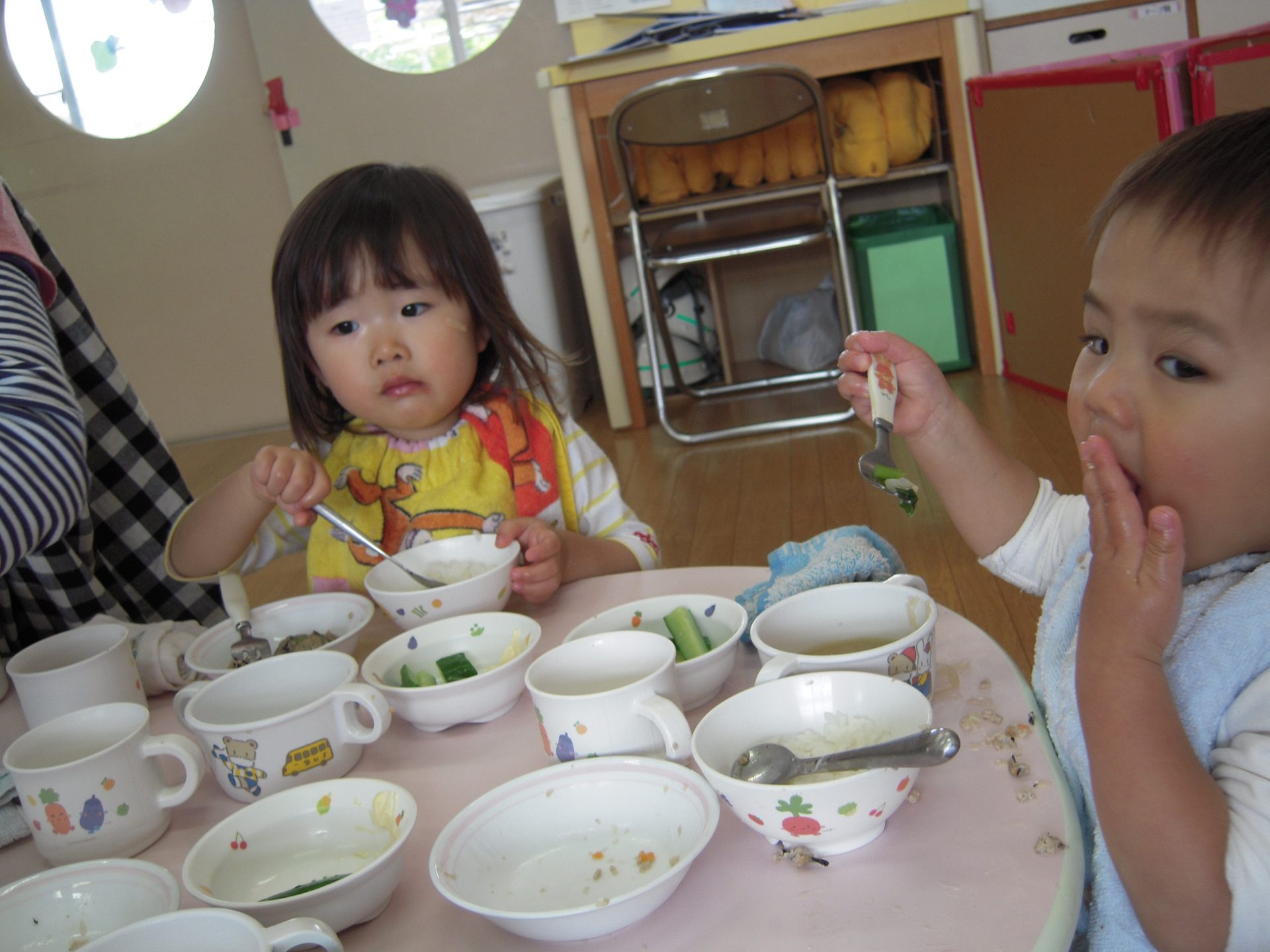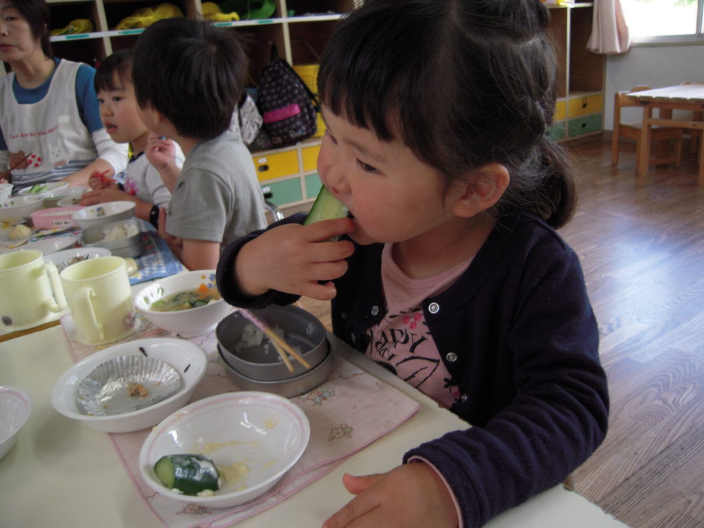 2歳児さんも、手できゅうりを持って、マヨネーズをちょん、ちょんと上手につけて食べていました。