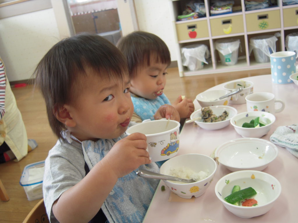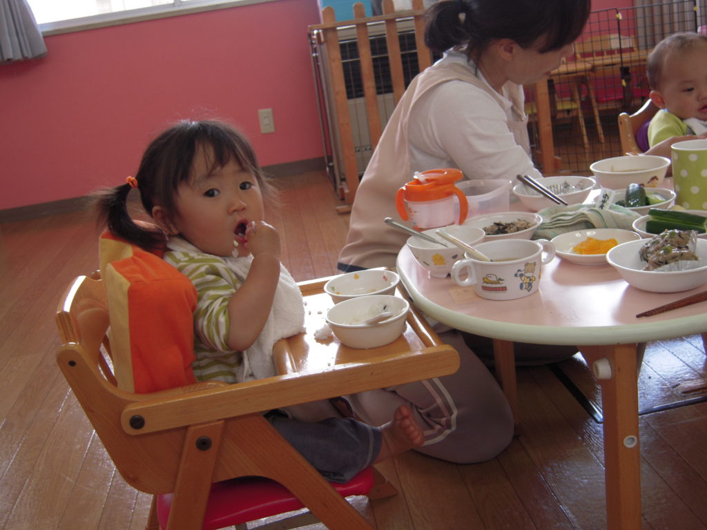 0・1歳児さんは日頃から手づかみで、手と口の協調運動を促し、食べ物を上手に口に取り込むこと、前歯でかじりとって奥歯や歯茎で噛むことを練習しながら食べています。