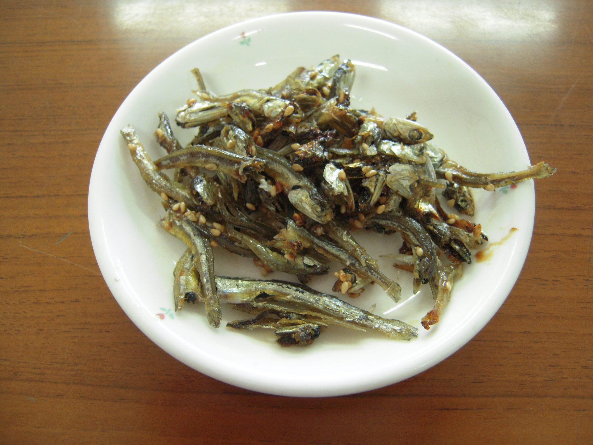 ◯ カリカリたつくり(カルシウムたっぷりのたべる煮干しを素揚げして、砂糖・しょうゆ・みりん・カレー粉を煮立てた甘辛いたれとごまをからめました)