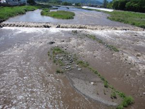 勢いよく流れる川の水音に思わず橋の上から覗き込んでいました。「水が泥水だぁ」「泥水だぁ」いつもと違う事に気づいた様です。「雨降った後だからね。川の水がこんな色になっているよ。帰りにまた、見てみよう。どうなっているかな」