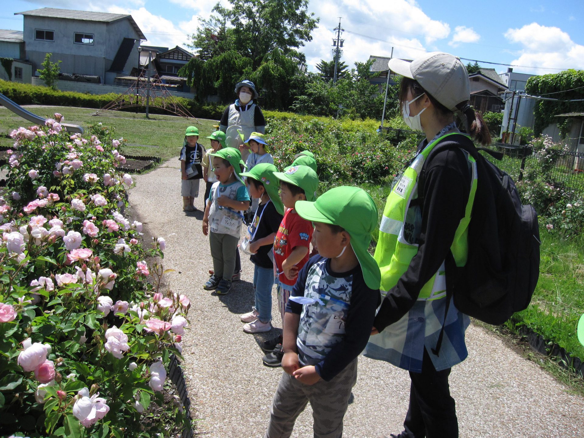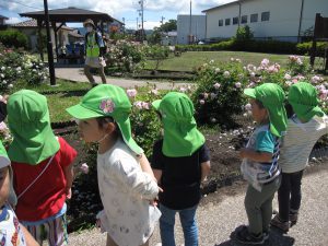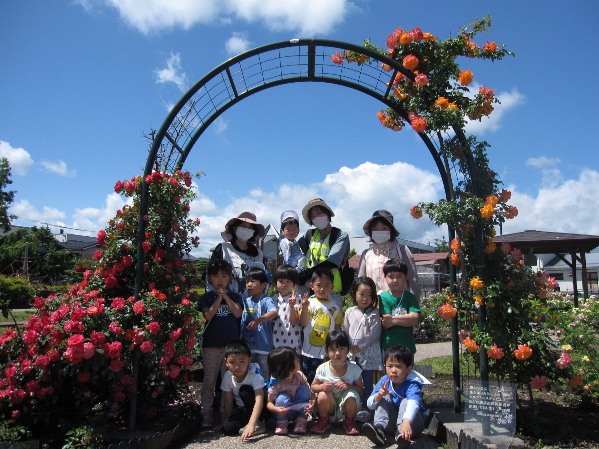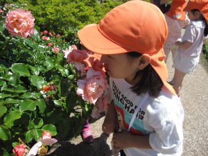 ばら公園では、色々な種類や色のばらが咲いていて見たり匂いをかいだり花びらを集めたりしました。