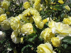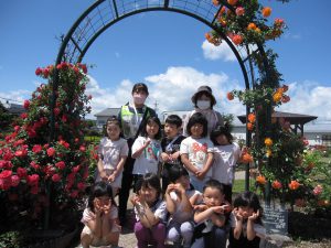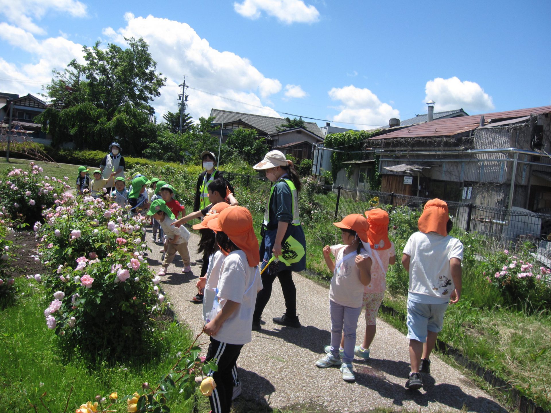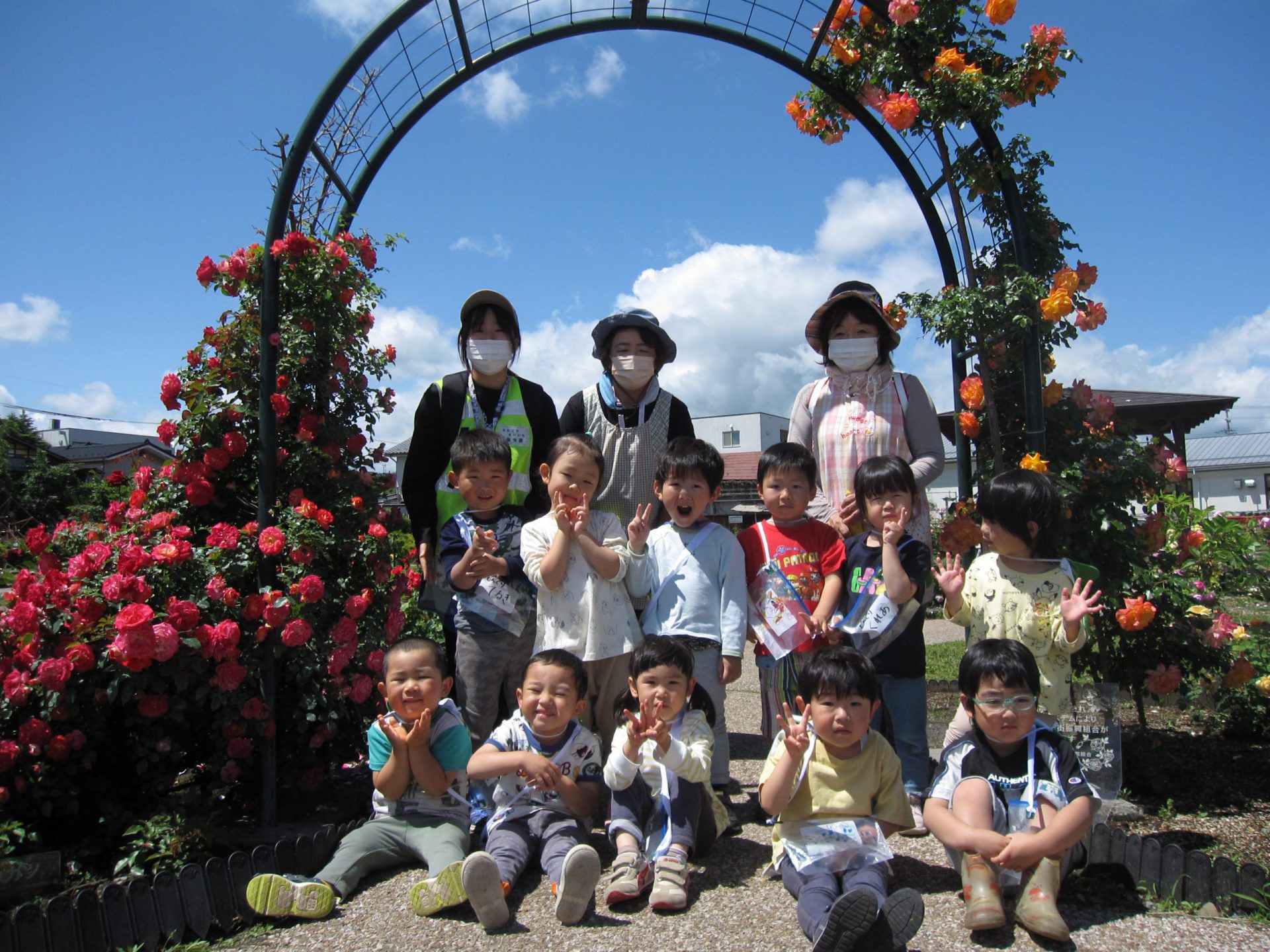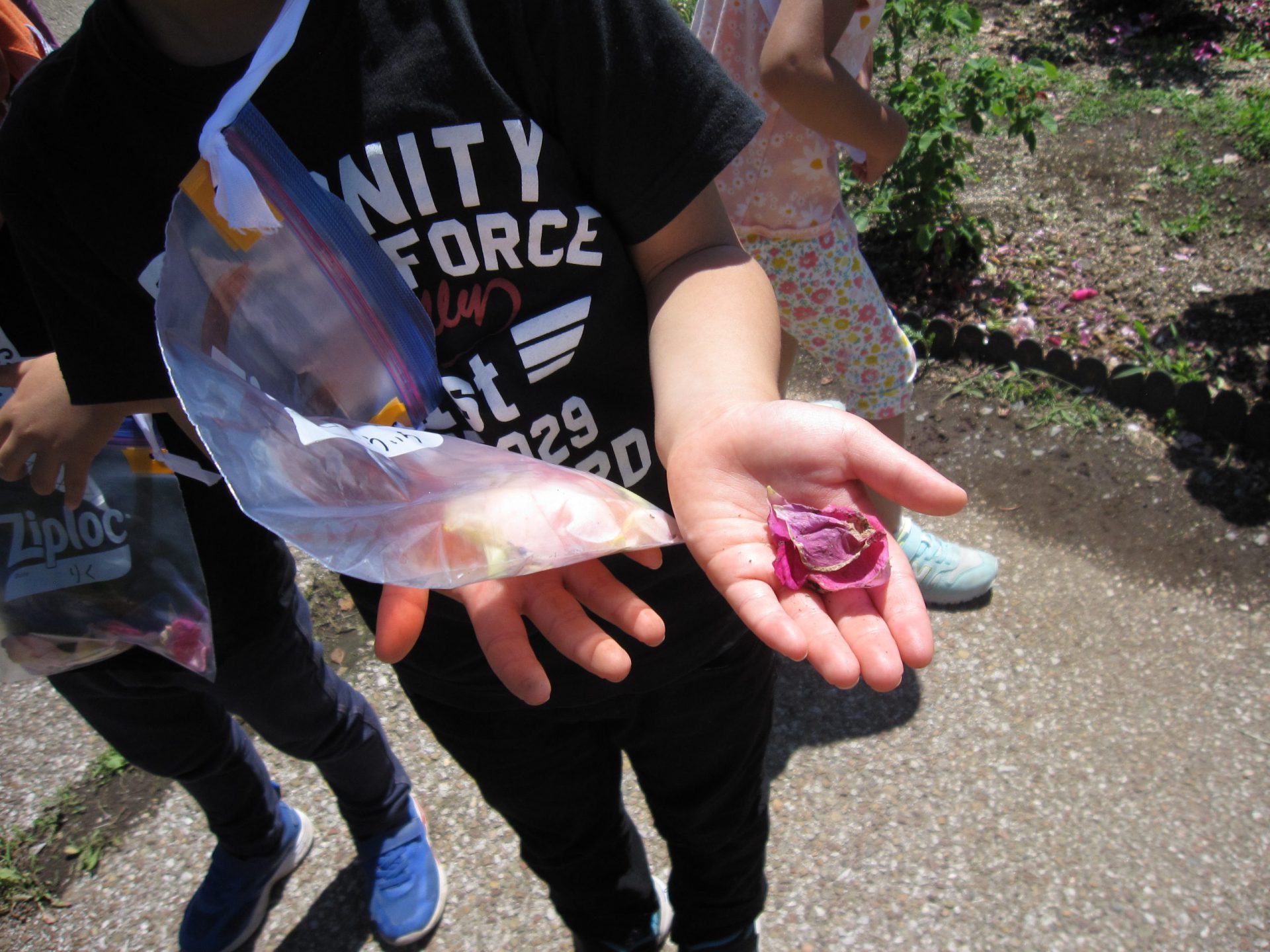 ばら公園では、色々な種類や色のばらが咲いていて見たり匂いをかいだり花びらを集めたりしました。